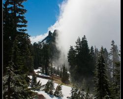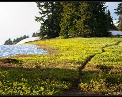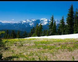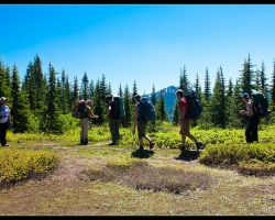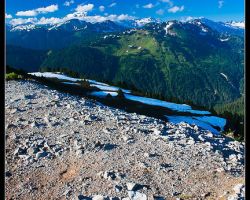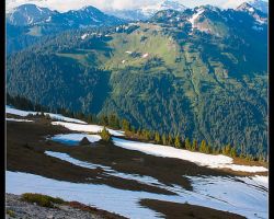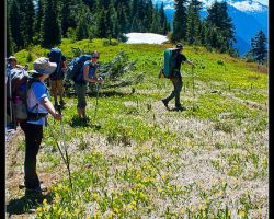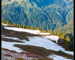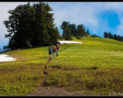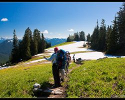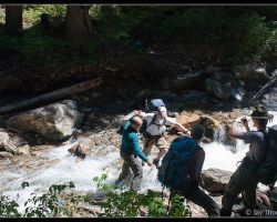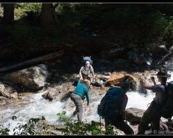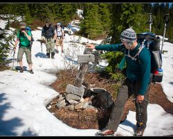 In the morning we had breakfast and headed out. The day was to be longer in distance but downhill the whole way. The plan was to do a big loop consisting of part of the PCT and the Pass Creek Trail. We had a few miles of snow to hike through and Kevin did an outstanding job keeping us on the correct path. The Pass Creek trail was badly overgrown and there were a few down trees. As with the Cady Ridge Trail, Kevin did a good job of clearing the trail of the smaller trees with his WTA saw when he could, but some of the trees were just too big and will require a full crew to clear. The Pass Creek trail also had a couple of Bridges that were washed out necessitating a couple fords. Luckily we were able to take advantage of a couple trees that we used as a bridge to cross Pass Creek itself, but unfortunately we had to get our feet wet crossing the NF Skykomish (this all just added to the fun and adventure of the trip