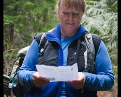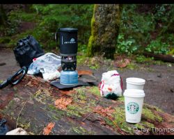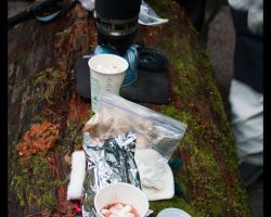 Cheryl's hot cocoa with marshmallows in genuine Starbucks cups! Big Kahuna panini I bought at the Longhouse Market on the way to the trail. Learning about Ron's Bear Grylls hiking pants. Hiking with friends!