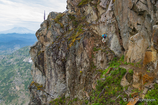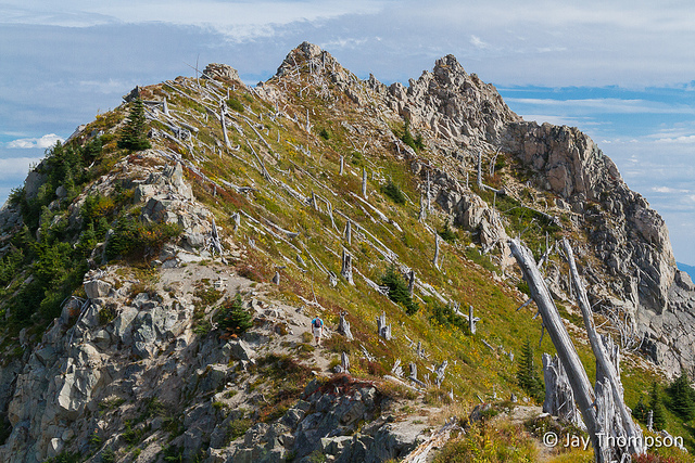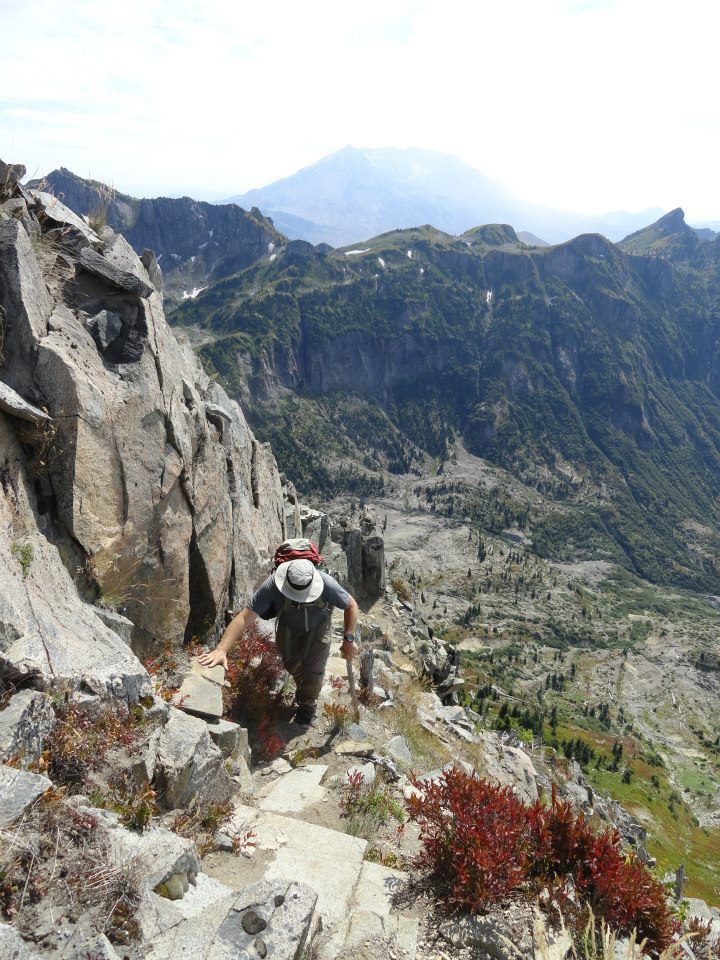 I had the good fortune and privilege to hike with guidebook author, Craig Romano on the weekend of Sept 8th 2012. Craig is the author of several of the Day Hiking series Mountaineers books. We hiked the Mt Whittier "trail" in the Mt Margaret Backcountry of Mt Saint Helens. We also hiked the Lakes trail and some of the Boundary trail as part of the loop, but Whittier was what we were there for. Peder who I know from the Portland Hikers forum had hiked the trail a few times and was gracious enough to invite us along and show us the way. The Mt Whittier trail is not much of a trail, more a route really. The forest service gives it a black diamond status which we soon discovered was very appropriate. To be honest, I'm not really sure why the forest service advertises this as a trail at all as I found it to be quite dangerous in a few places. Route-finding skills are a definite must on this one. Fortunately we had Peder as our guide and Craig mapped the entire thing for Green Trails Maps. Future versions of the map for this area should include the new data. The trail depicted on the current map is incorrect as there has been a reroute due to a washout.