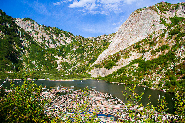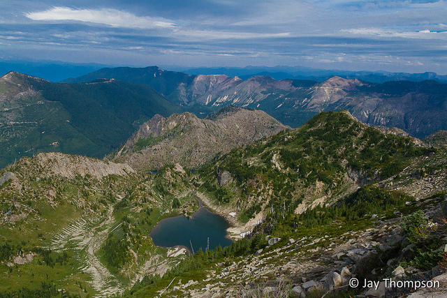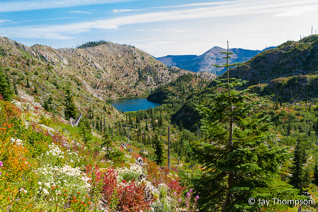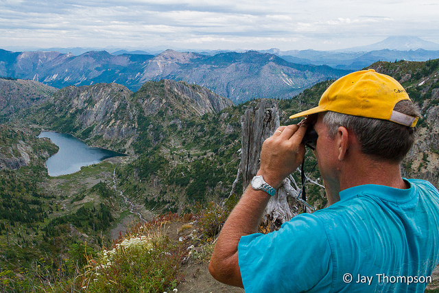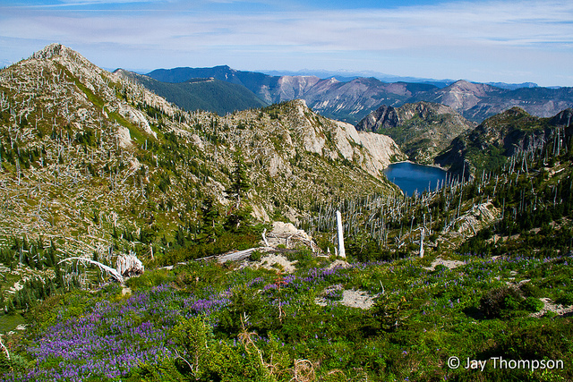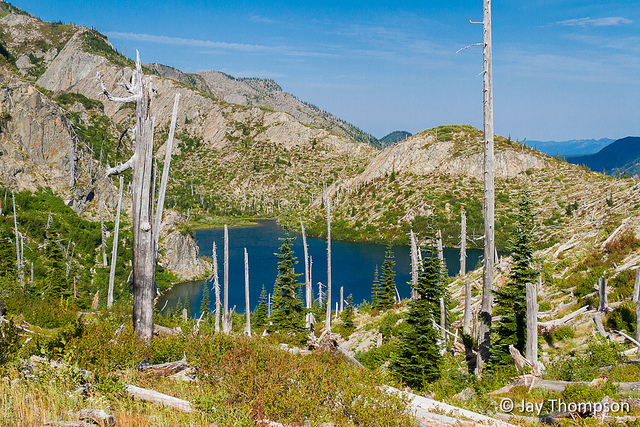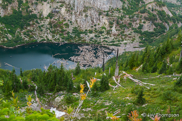 First View of Panhandle Lake. We met three ladies on the trail that camped here overnight. They really enjoyed it and had the place all to themselves. When we talked to them, Craig explained that he was going down to the campsite to map it and that he was working for Green Trails. He also said he was a guidebook author at which point I blurted out "This is Craig Romano"! The ladies were thrilled to meet him and explained they got the idea to camp here from his book Backpacking Washington, hike #15 Mt Margaret Backcountry Lakes. Craig says this is the best camp on the Lakes Trail.