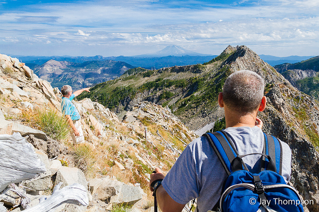 Peder pointing out the trail that follows the ridge to the top of Whittier