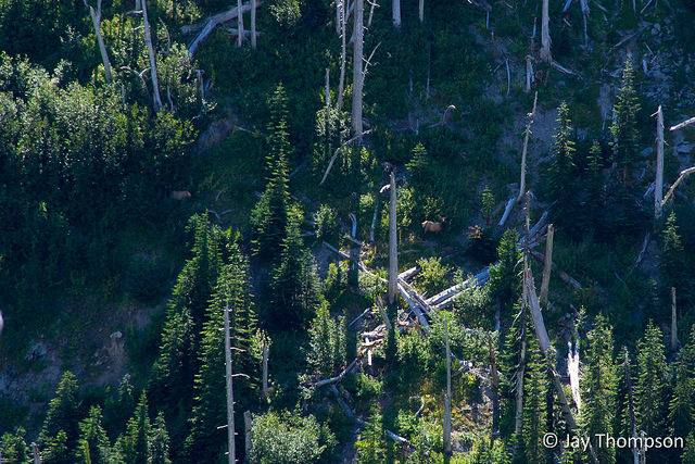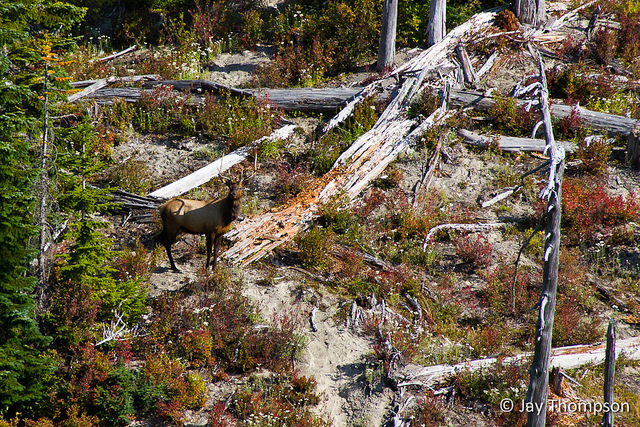 You spotted the one elk – and subsequently a second one! It is amazing how well they blend in with their surroundings. Two years ago I took a picture of about 50 elks on the mudflats below the west side of Mt Whittier; and when putting the picture through Photoshop, I saw that there was a bull elk quite close to me. I completely missed this elk while sitting on the summit looking around for about an hour…