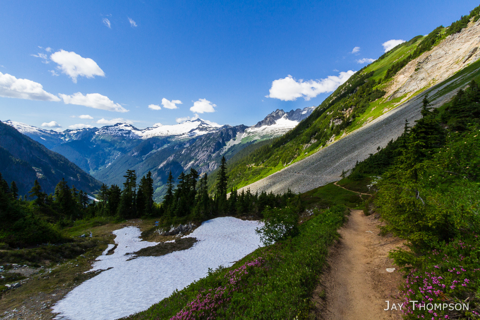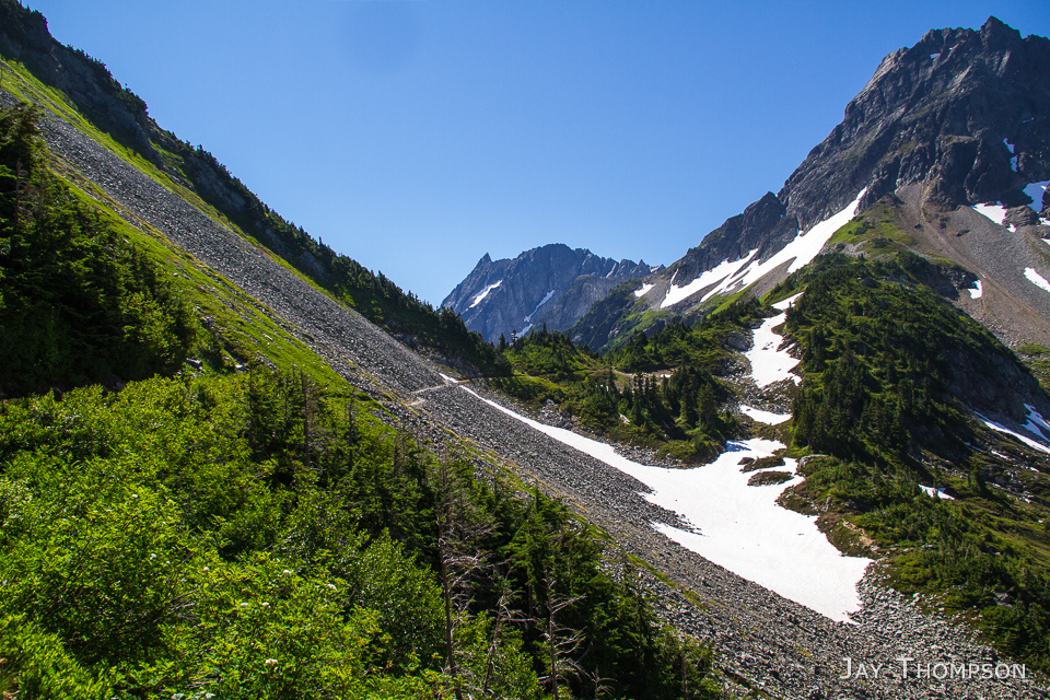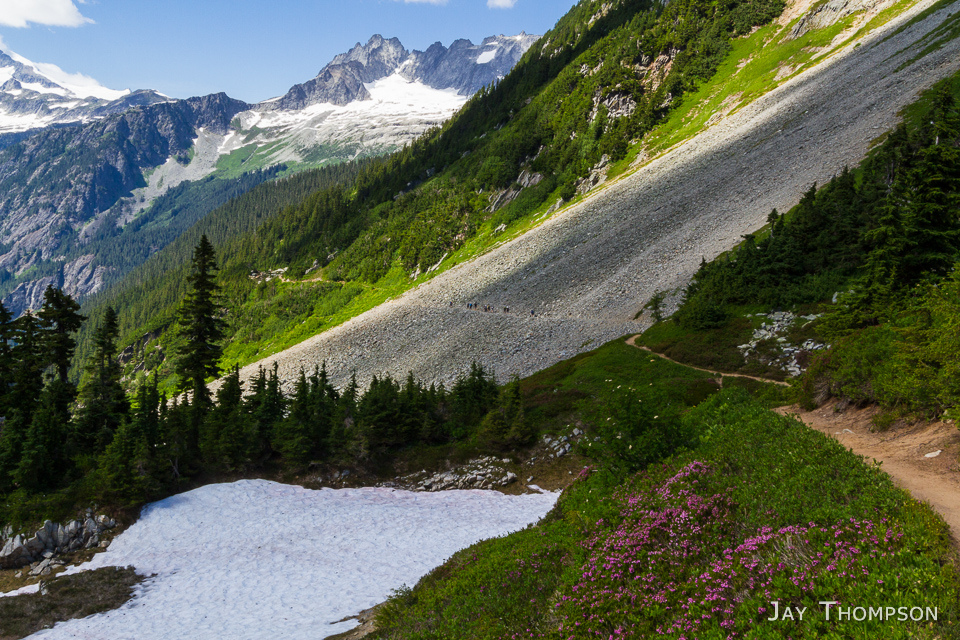 Update: Two weeks after my hike up Sahale Arm, Thunderstorms moved through the area bringing torrential rainfall. A landslide at an already bad logjam at Boston Creek on the Cascade River Road 3 miles from the trailhead caused a major washout of the road stranding 65 people at the trailhead overnight. Luckily for the stranded hikers, temporary repairs were made to get the folks out of there before more serious repairs to the road could be done. See the links below for the story.