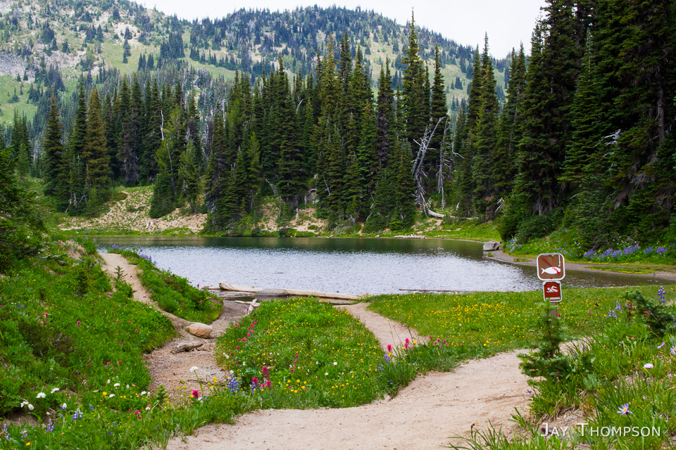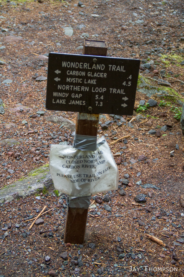 The start of our hike at Mowich lakeFlowers out but no bugs yet.The limited views at Mowich Lake.Avalanche liliesToo socked in for many pictures with views so a lot of sign pictures were taken.Into the void. This was our view from Ipsut Pass.This is the the view my son and I had from the same spot a few weeks prior.Ipsut CreekA new bridge over a side stream near Ipsut Creek.You are greeted with this sign at the bottom of the hike down from Ipsut Pass.Carbon RiverThis tributary of the Carbon River had a lot of algae and moss in it.We saw this huge salamander feasting on a slug. It was really kind of gross. I believe it was a Coastal Giant Salamander. The quarter is for size reference.The trail was washed out near the carbon River suspension bridge requiring an alternate trail on the other side of the river.Due to the trail being washed out and rerouted, we didn't have to cross the suspension bridge. I did cross it however on a dayhike I did the previous year.The trail above the Carbon River heading up to Moraine Park.SQUEAK!Waterfall along the trail flowing into Moraine CreekMoraine CreekJust below Moraine Park.I thought this grass was interesting. Still not sure what it is.Wildflowers along the trail near Moraine ParkSeconds before I snapped this shot, a Pika was sitting on the rock in the center of the image. You can see it's den under the rock. During the day in summer, Pikas gather bits of vegetation or "hay piles" and lay it out to dry. Here you can see the hay pile has been brought in. They rely on these hay piles for food during the winter. I think Pikas are interesting little critters. You can read up on them on this Wikipedia page.Marmot at Moraine ParkChipmunk at Moraine ParkThe Mountain was trying to come outMoraine Park MeadowsAt the pass between Moraine Park and Mystic Lake, the Mountain decided to reveal herself for the first time all day.Mystic LakeWildflowers everywhereOur humble little camp for the night