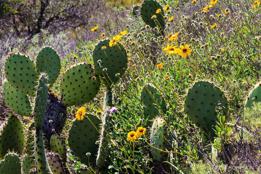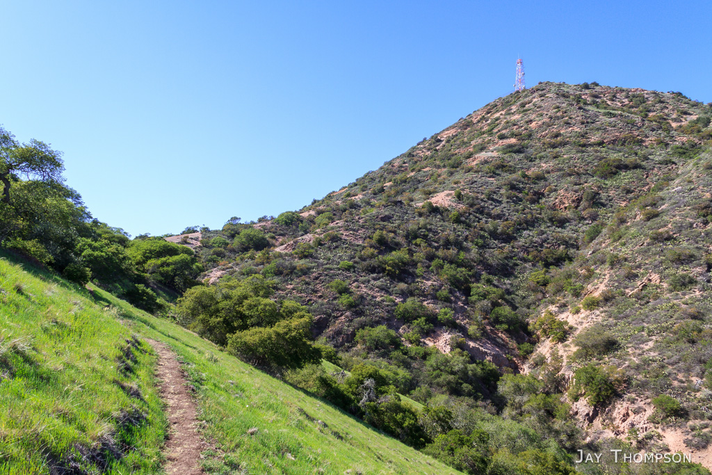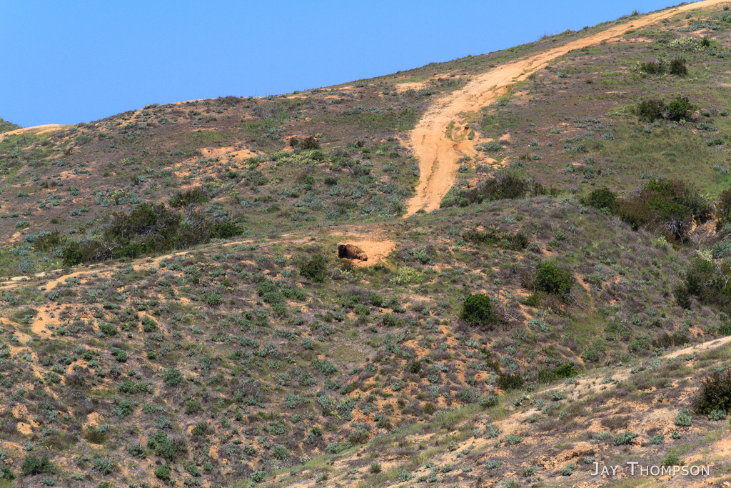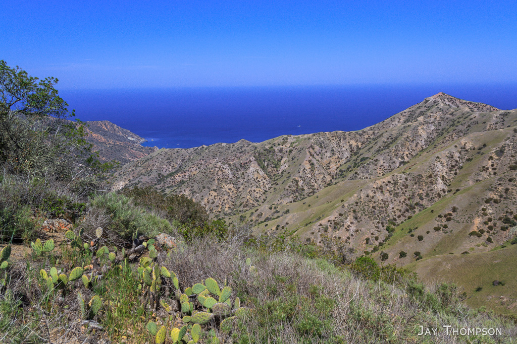 So the hike was fairly uneventful from here. I made pretty good time on the trail which at this point is actually an old road called the Renton Mine Rd. Soon enough I was on the ridge above Avalon. I caught something out of the corner of my eye on the road in front of me. There was a little Catalina Fox standing there just looking at me. I was enjoying the scenery with the cactus and ocean views all around. Still being spring, there were lots of flowers still. A lot more than I expected for drought plagued Southern California.