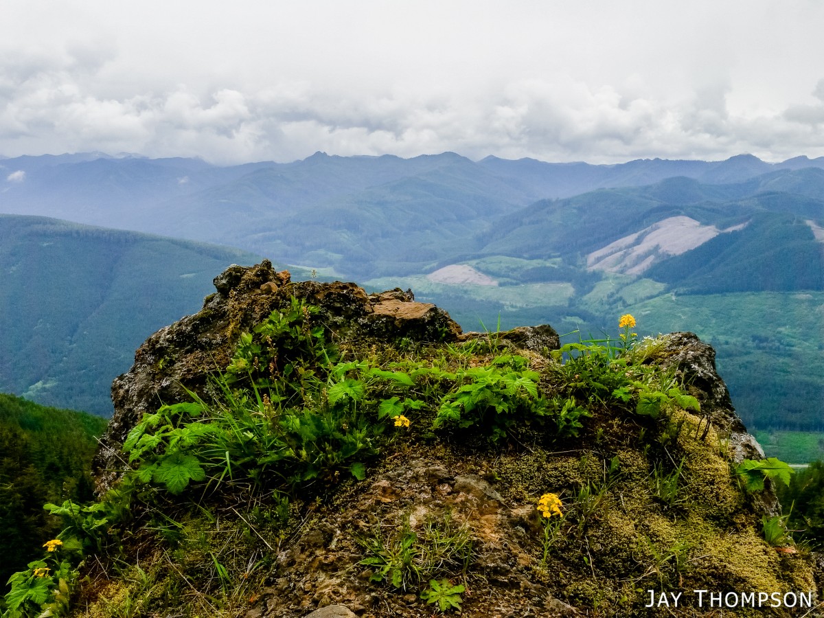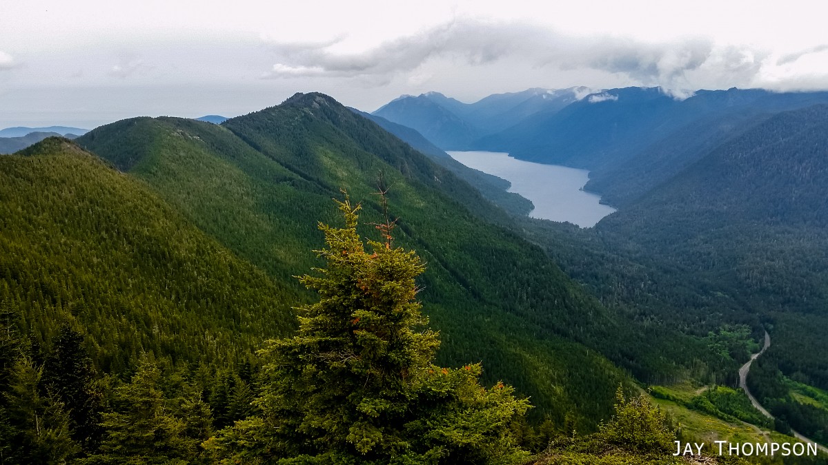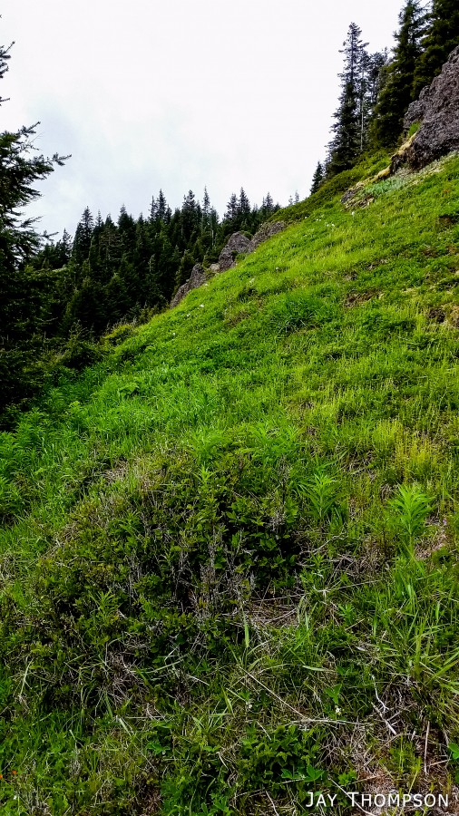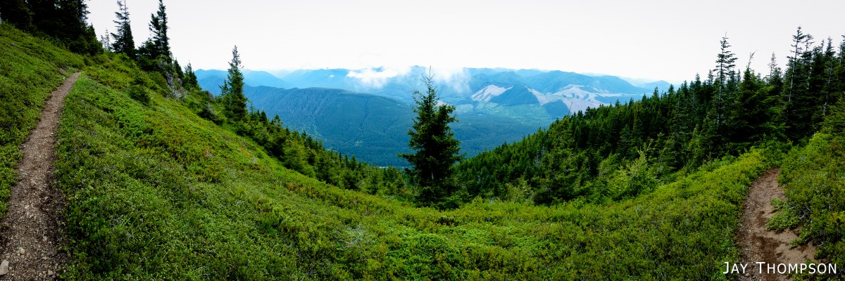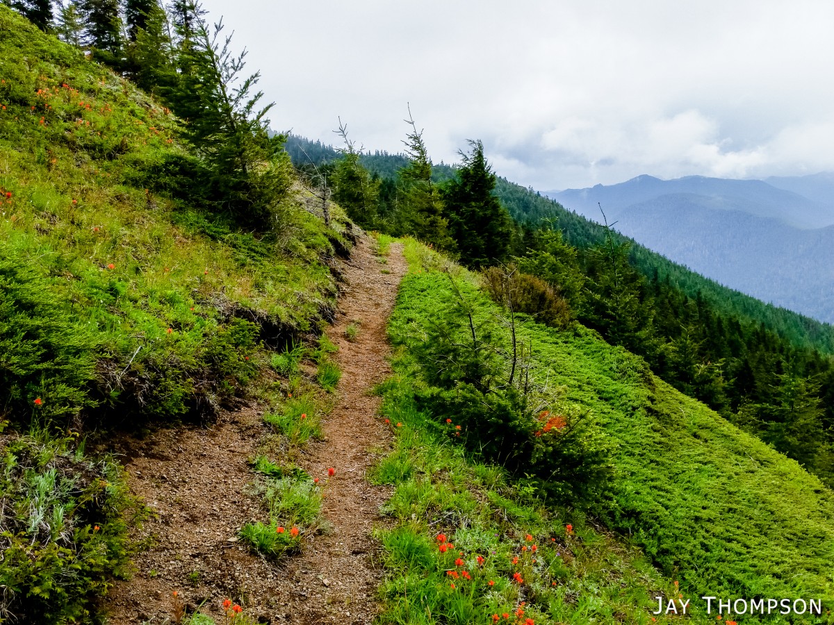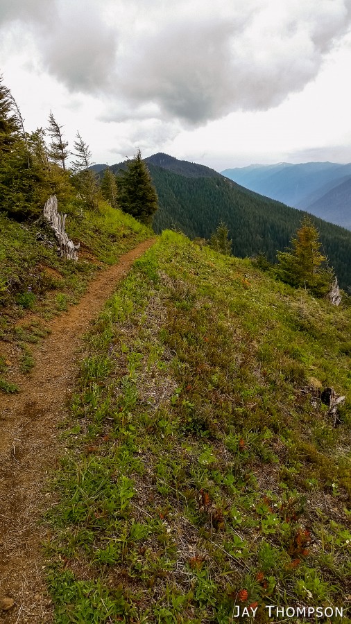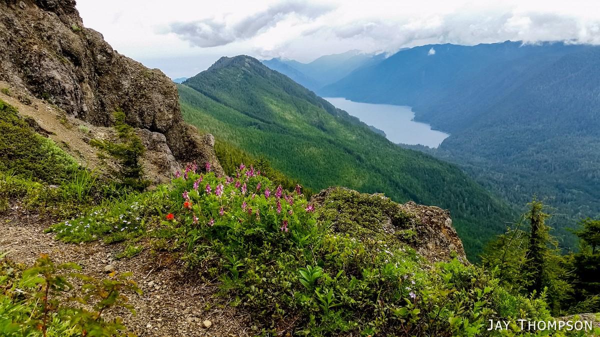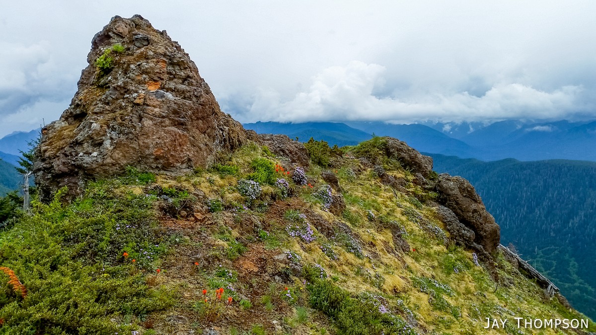 The ridge crest and mountain itself were delightful. Being at such a relatively low elevation, the ridge crest is heavily wooded, however there are still occasional views to be had. Places such as Grouse Meadow, Jasmine's Meadow and Allison's Meadow were filled with several types of Olympic Mountain wild flowers and the views across the valley were pretty nice. Unfortunately for me, the clouds obscured any views of Mt Olympus that I had heard about. Views from the very top of the mountain were not to be, since it is so heavily wooded, but just below the summit at Panorama Point (unsigned but hard to miss), one gets some very nice views down at Lake Crescent.