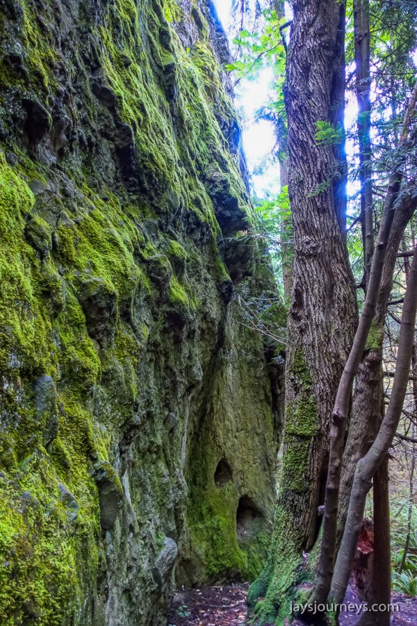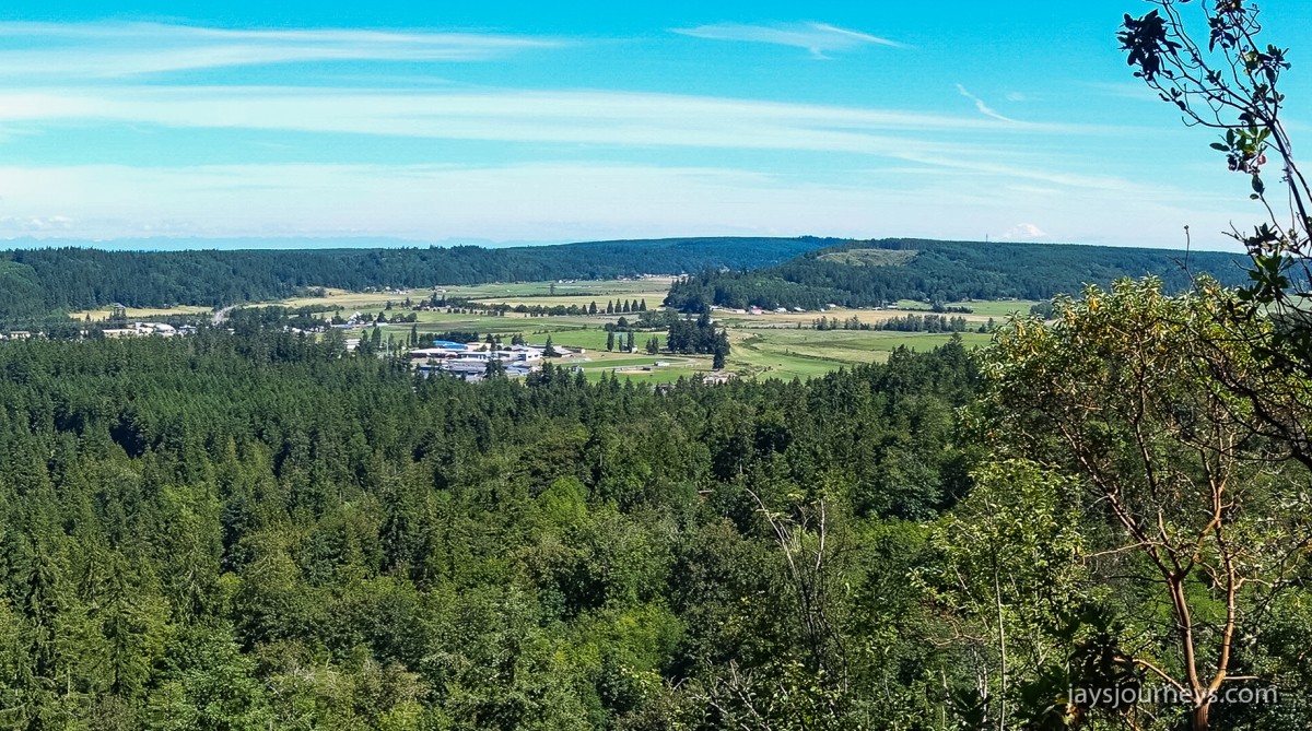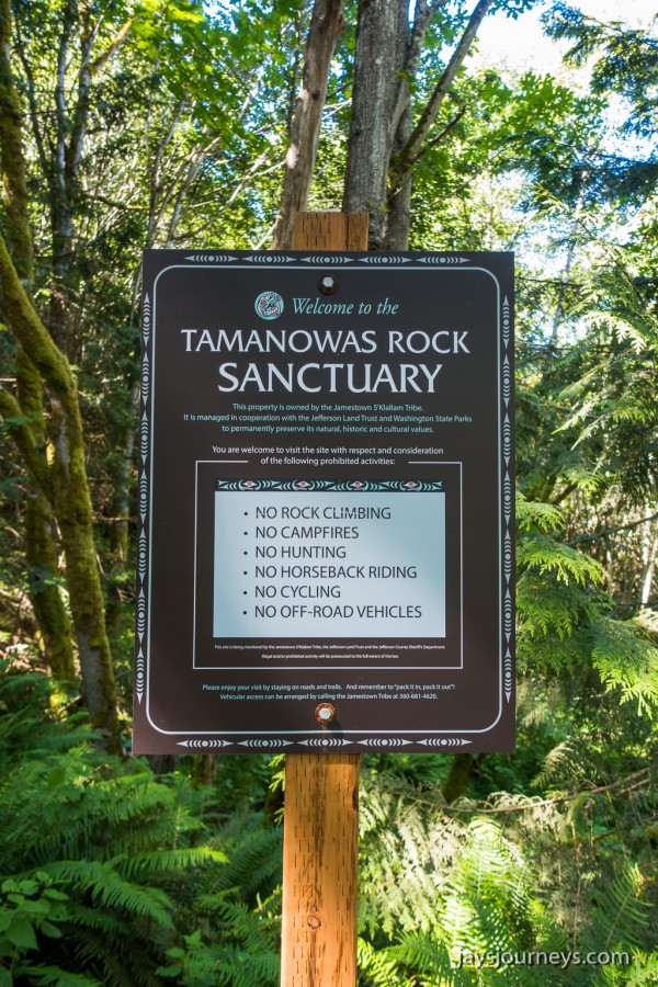 To find the Tamanowas Trailhead. Driving towards Port Townsend, turn left off of Hwy 19 onto Anderson Lake Road. In just over half a mile, turn right into a small parking area. There is a sign for the site and the trail starts there. It's not too far of a walk to the rock at just over 3/10ths of a mile. The rock sits next to a cliff. If you find yourself going steeply uphill on the trail next to the cliff, you probably missed the side trail to the right that goes to the rock. If you do go the wrong way, its not a big deal because the views from the top of the cliff overlooking Chimicum and the High School are pretty nice too. We could see Rainier and many of the Cascades in the distance. Go far enough on the cliff trail and you will see the top of the rock from an overlook. There were a couple of lesser trails branching off from the top of the cliff heading east that I believe connect to the Anderson Lake trail system, but we didn't have time to investigate those.