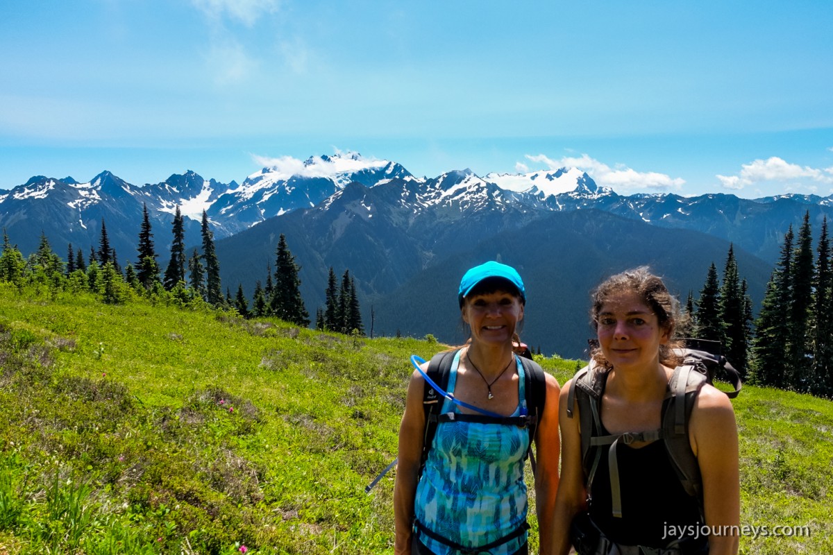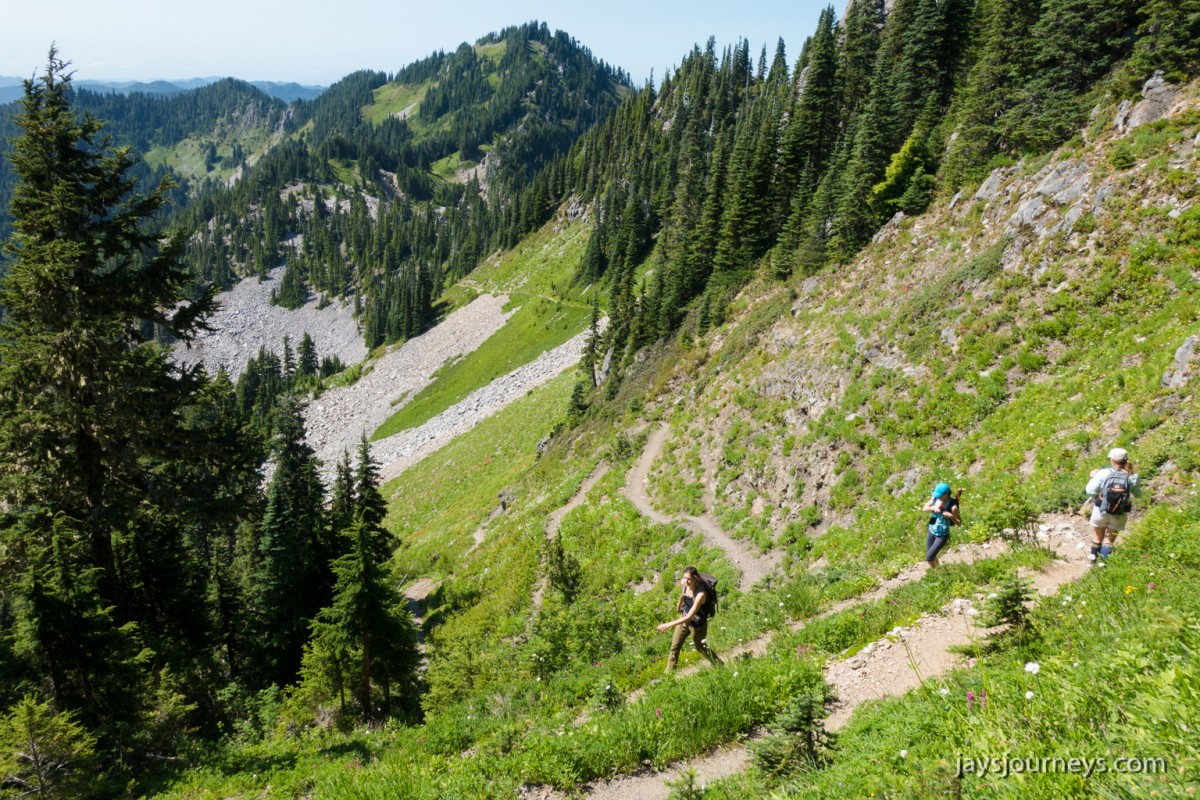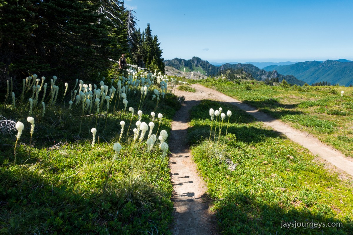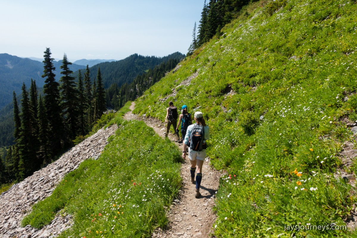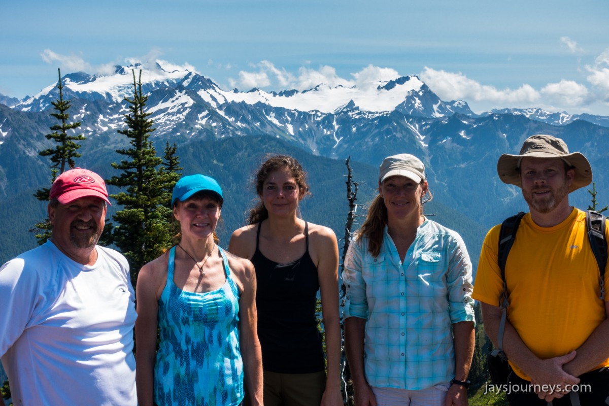 Group shot, minus me. Left to Right - Deborah, Jessica, Patti, and PaulNorth Fork Sol Duc TrailPink (or Red) Mountain HeatherNorth Fork Sol Duc River Trail just below Heart Lake.Selfie above Heart Lake.Patti and Jessica on the High Divide. Mt Olympus in the background.Magenta Indian PaintbrushMt Olympus from what I call the "Miracle Mile" on the High Divide.Olympus from the High DivideLake Number 8 and Morgenroth Lake in the distanceAmazing ridge walking on the divideAmazing ridge walking on the divideMountain AsterBeautiful trail!Bogachiel Peak and Seven Lakes BasinLots of Bear Grass BloomsSeven Lakes BasinSeven Lakes BasinSeven Lakes Basin from Bogachiel PeakGroup shot on Bogachiel PeakPaul on Bogachiel PeakTo continue the loop, we take a right at the low point (saddle) near the center of the image. The trail to left of center continues down to Hoh Lake and the Hoh River. The steep bank immediately to our right is Bogachiel Peak. Not pictured is the short spur trail near here that leads to the top of Bogachiel Peak.This is looking back at the saddle we just passed. This view of Mt. Olympus is iconic, and has graced the cover of at least one trail guide as well as several magazines over the years.Flowers still in bloom!Flowers still in bloom!The long and winding pathIt was such a great day!Paul on the downhill now.You have to love walking in the forest and coming up to an opening in the trees with a view like this.One of several lakes you pass on the way back to the trailhead.Big Tree ButtLots of HuckleberriesSol Duc FallsSol Duc ShelterOn Sol Duc Hot Springs Rd, a tree had fallen across the road making it impossible to drive out.Luckily for us, Jessica had an axe in her truck and everyone trying either to escape or get to the trailhead, came together and cut the tree and moved it by hand.Working together to move the fallen tree.Thanks Jessica!Thanks for looking at my High Divide report!