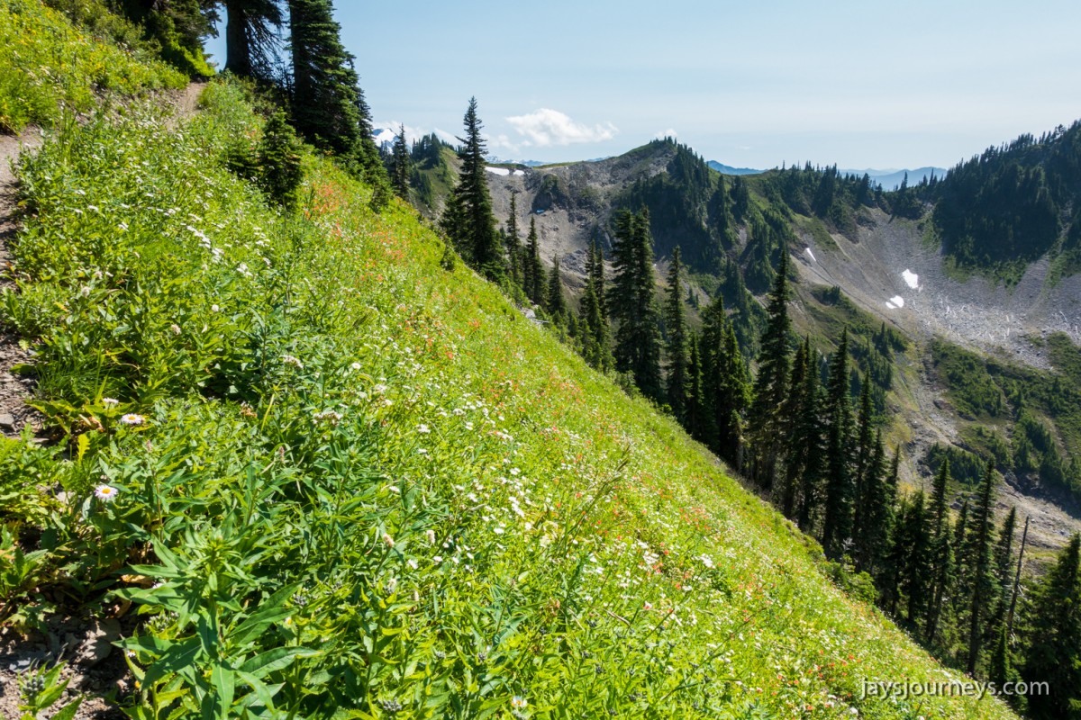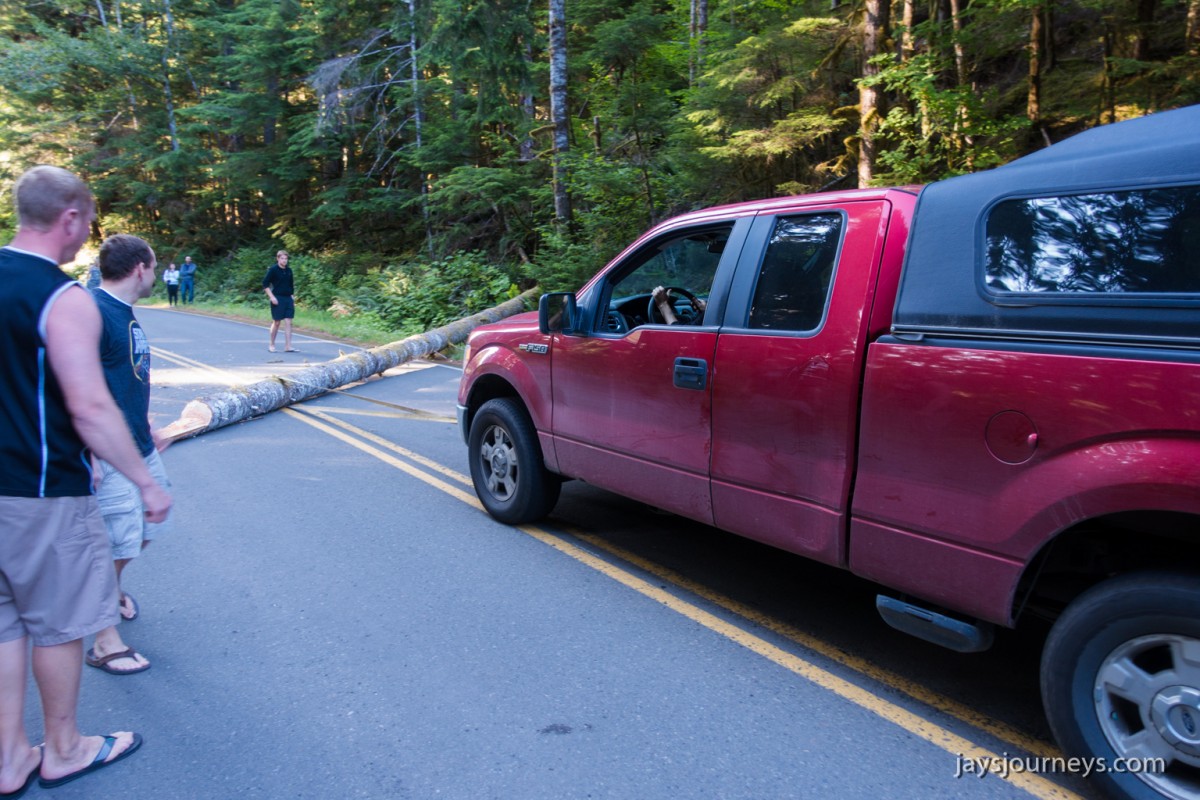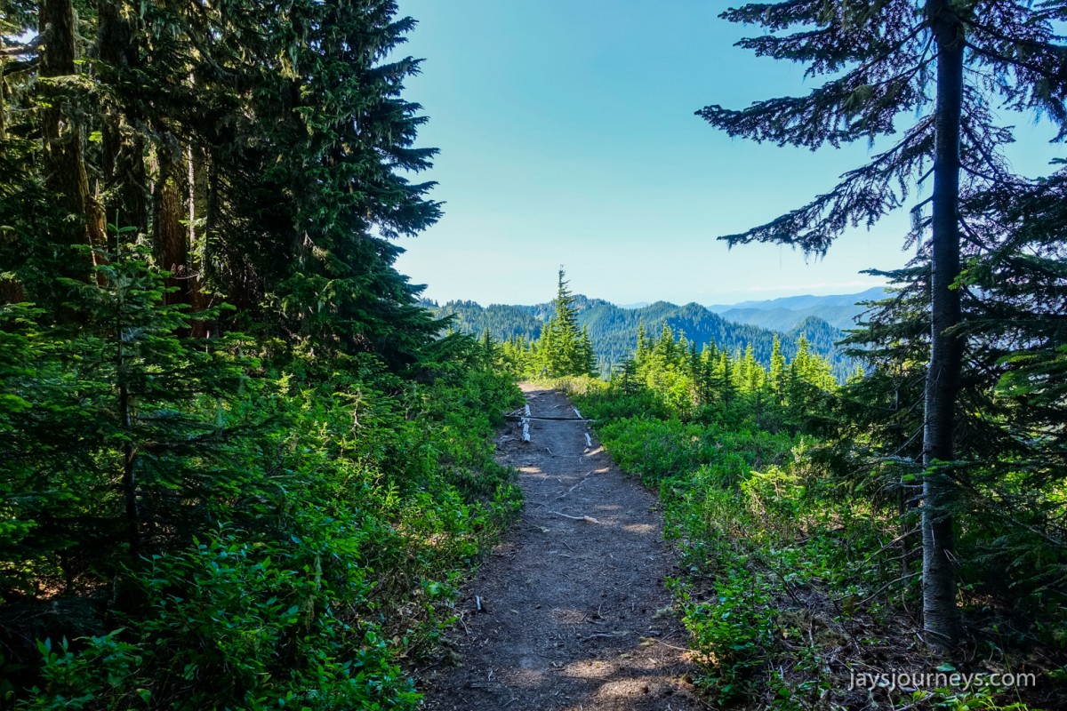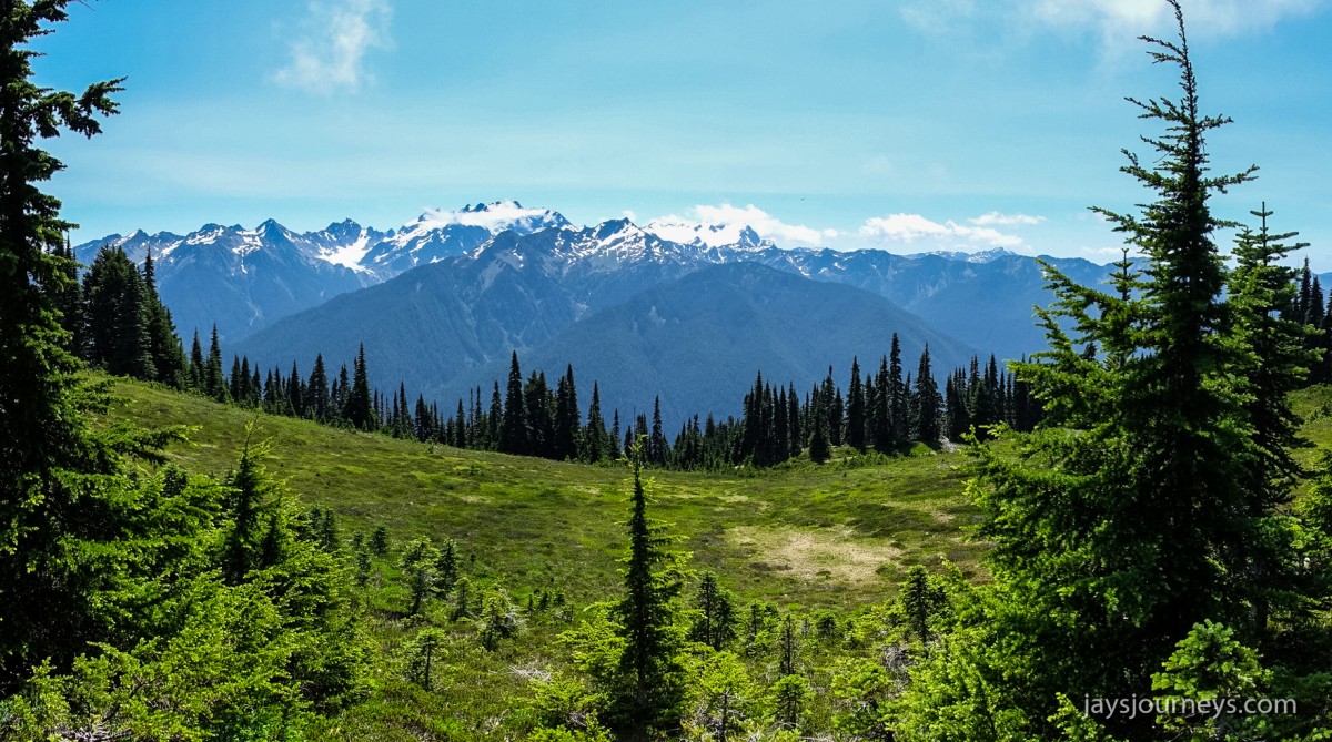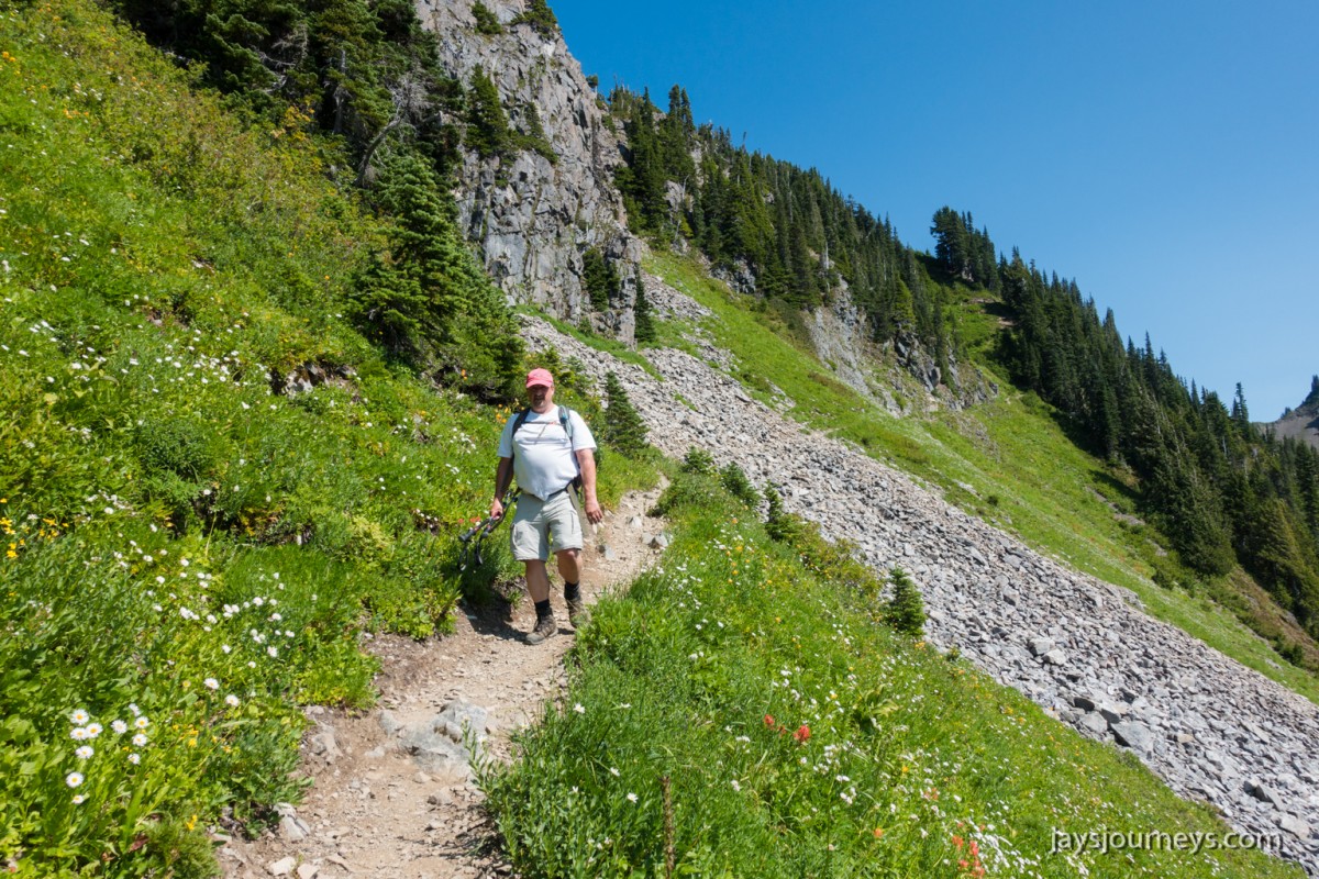 Group shot, minus me. Left to Right - Deborah, Jessica, Patti, and PaulNorth Fork Sol Duc TrailPink (or Red) Mountain HeatherNorth Fork Sol Duc River Trail just below Heart Lake.Selfie above Heart Lake.Patti and Jessica on the High Divide. Mt Olympus in the background.Magenta Indian PaintbrushMt Olympus from what I call the "Miracle Mile" on the High Divide.Olympus from the High DivideLake Number 8 and Morgenroth Lake in the distanceAmazing ridge walking on the divideAmazing ridge walking on the divideMountain AsterBeautiful trail!Bogachiel Peak and Seven Lakes BasinLots of Bear Grass BloomsSeven Lakes BasinSeven Lakes BasinSeven Lakes Basin from Bogachiel PeakGroup shot on Bogachiel PeakPaul on Bogachiel PeakTo continue the loop, we take a right at the low point (saddle) near the center of the image. The trail to left of center continues down to Hoh Lake and the Hoh River. The steep bank immediately to our right is Bogachiel Peak. Not pictured is the short spur trail near here that leads to the top of Bogachiel Peak.This is looking back at the saddle we just passed. This view of Mt. Olympus is iconic, and has graced the cover of at least one trail guide as well as several magazines over the years.Flowers still in bloom!Flowers still in bloom!The long and winding pathIt was such a great day!Paul on the downhill now.You have to love walking in the forest and coming up to an opening in the trees with a view like this.One of several lakes you pass on the way back to the trailhead.Big Tree ButtLots of HuckleberriesSol Duc FallsSol Duc ShelterOn Sol Duc Hot Springs Rd, a tree had fallen across the road making it impossible to drive out.Luckily for us, Jessica had an axe in her truck and everyone trying either to escape or get to the trailhead, came together and cut the tree and moved it by hand.Working together to move the fallen tree.Thanks Jessica!Thanks for looking at my High Divide report!