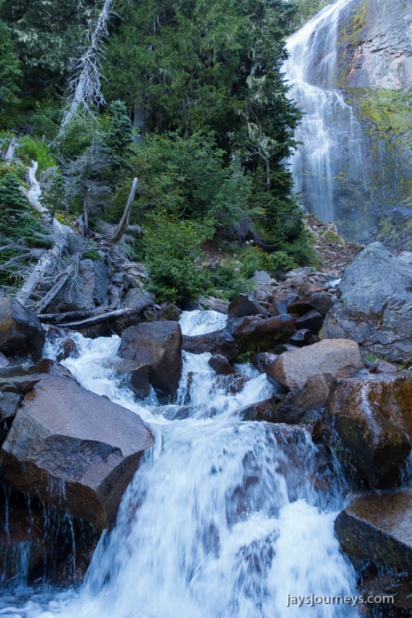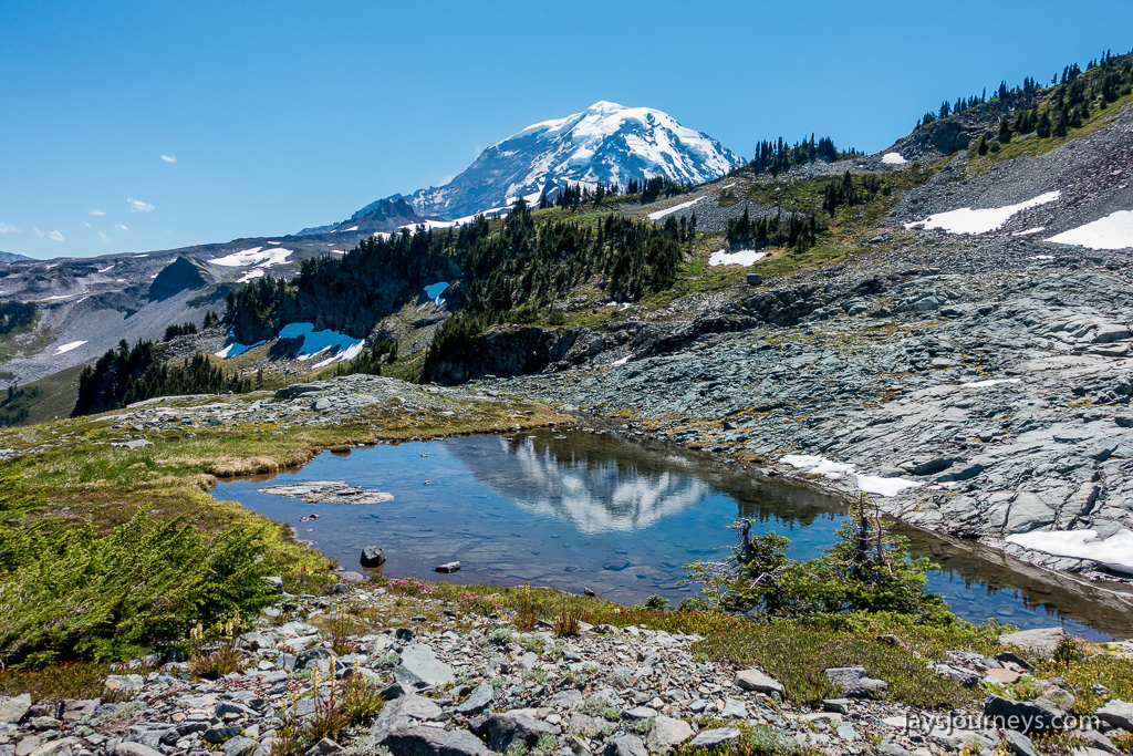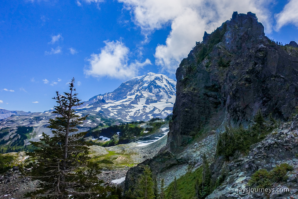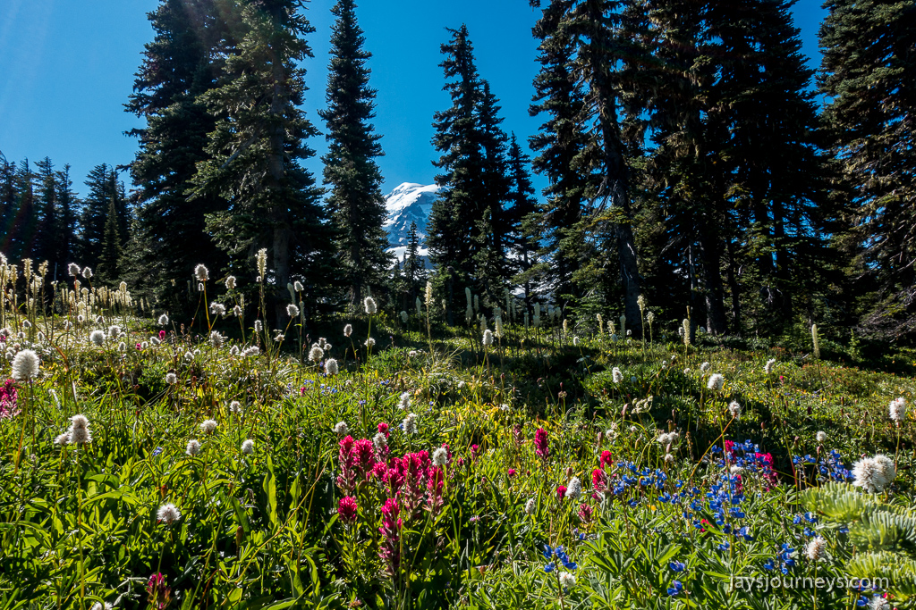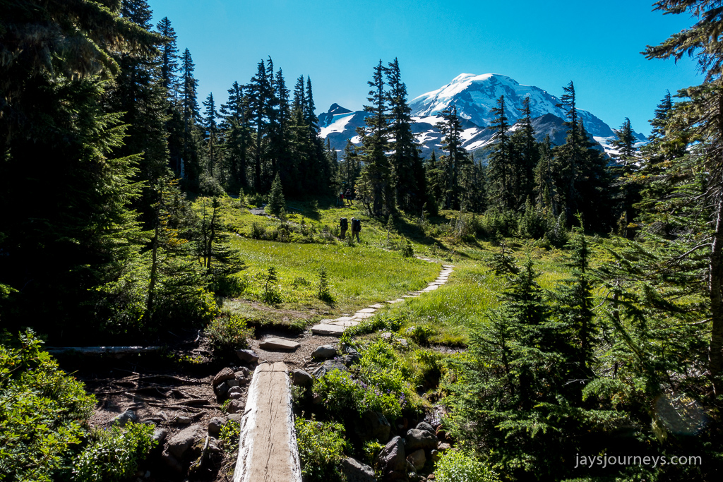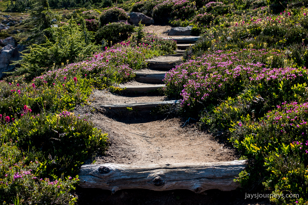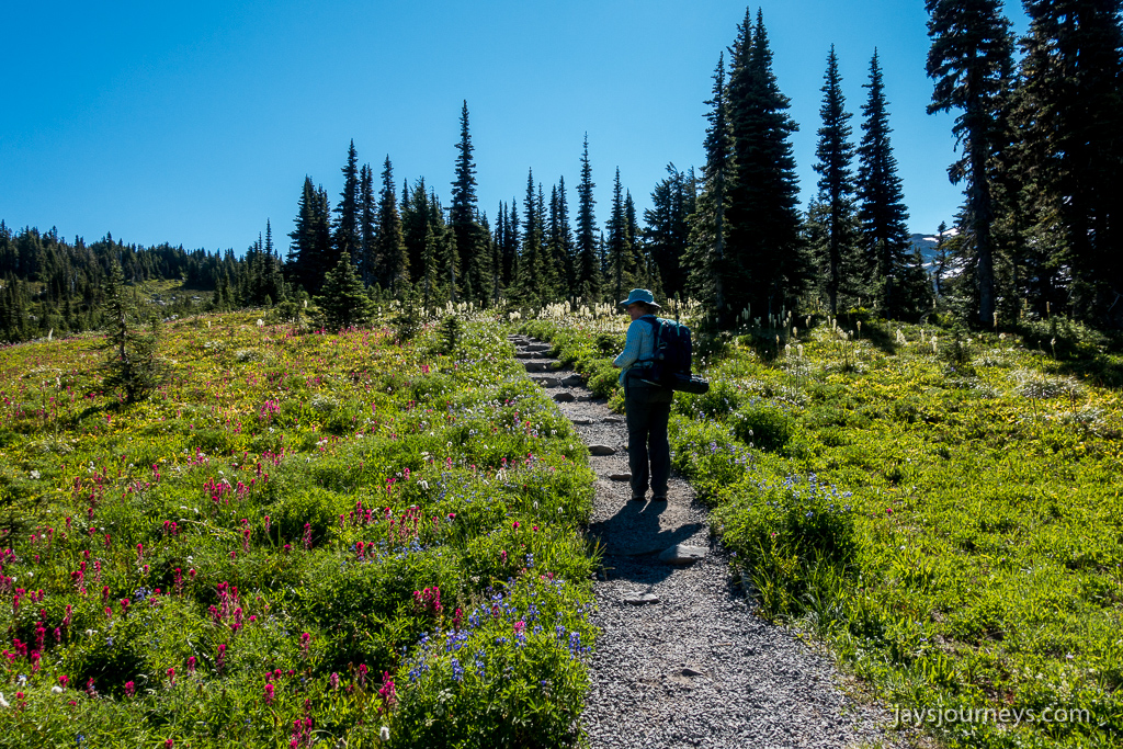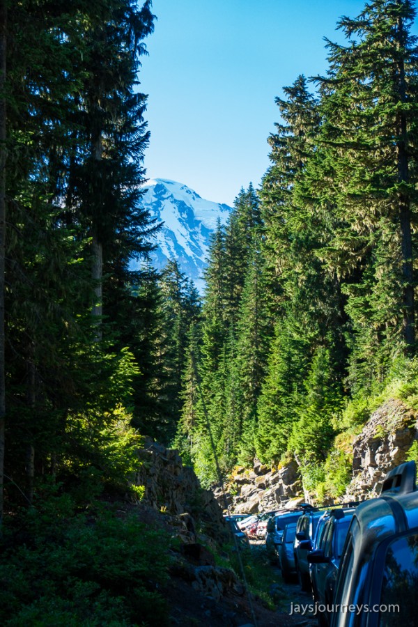 Parking area is always full in the summer. I've seen over a mile of cars parked along the shoulder.Spray Falls. The falls are on an offshoot of the Spray Park Trail and shouldn't be missed if you have the time.Spray FallsOne of the first meadows as you enter Spray ParkThe resident Spray Park bear. I've seen bears here on more than one occasion.I want to go up this side trail some time. The map below calls the summit on the left, Hessong Rock, while going right from the saddle would get you over to Mt Pleasant. I imagine the view is pretty spectacular.My hiking companion Cheryl inspecting the flowers.Flowers everywhere!Hikers approaching the high point of the Wonderland Trail alternate - Seattle Park.Mid Summer Avalanche LilyNature's garden.Beautiful flat meadow below Spray Park. The map below calls this Mist Park.Mountain Goats grazing up above near East Fay Peak.Looking back at the mountain from just Below Knapsack Pass.This imposing rock is on the Mother Mountain side of the pass. I just find it interesting.Mowich Lake from the pass.Looking back at Rainier from the pass.The Knapsack Pass resident Marmot.Heading down Knapsack Pass (or going up if coming from the Mowich Lake side), you can look back and see this cool rock formation. I call this rock "The Lovers" since it looks to me like they are kissing. The map below notes this as East Fay Peak.Looking back up at Knapsack Pass from about half way down.Flora and FaunaMowich LakeStand Up Paddlers on Mowich Lake.