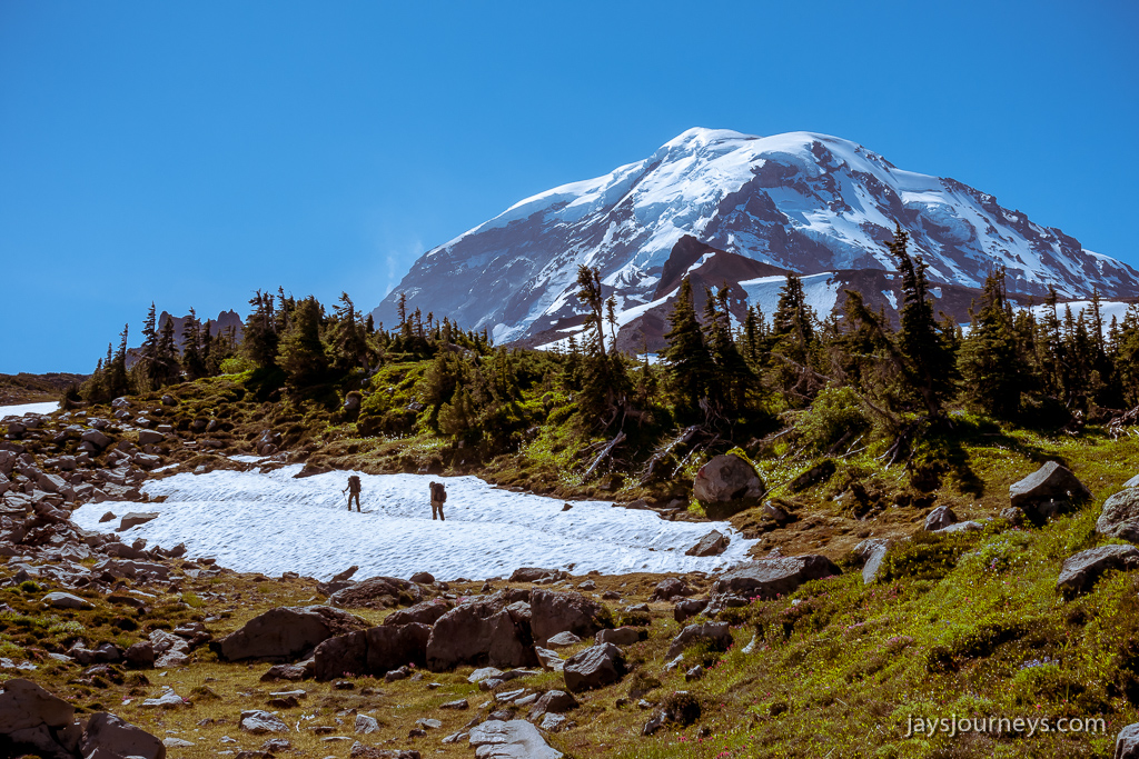 My hiking companion Cheryl and I set off to do a big hike that I had previously done I call the Spray Park Loop. The loop starts at Mowich Lake, goes through Spray Park and over Seattle Park, down to the Carbon River, then on to the Wonderland Trail for the return over Ipsut Pass. Its a pretty big hike at about 16 miles, and around 4500' of elevation gain. It is tough too because the last part of the hike requires a 2600' climb out of the Carbon River drainage. It's what I call an upside-down hike.
