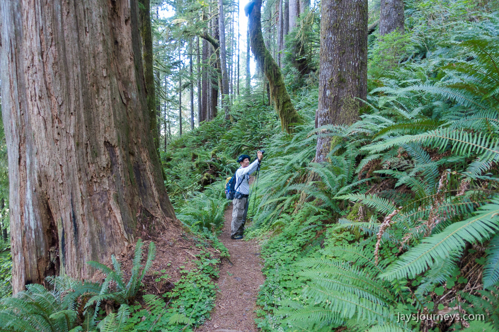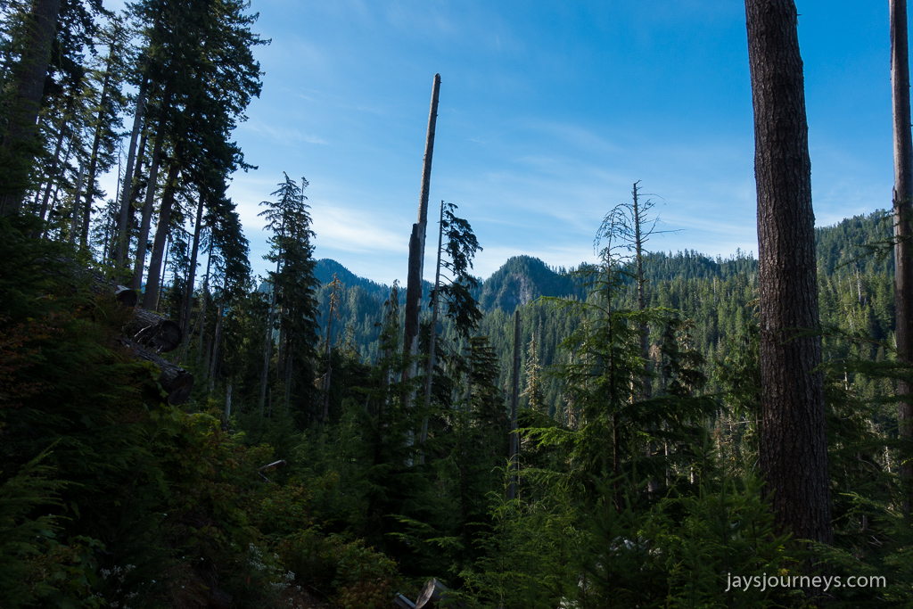 The trail is the original route to the top of Bob, and while it has considerably more elevation gain than Pete's Creek, it is also more enjoyable - at least in my opinion. The blow-down itself now serves as a large open window through the forest with views of the climb above. The trees along the old trail are quite massive being in a rain-forest and serve as a testament to how hard the blow-down was to clean up.
