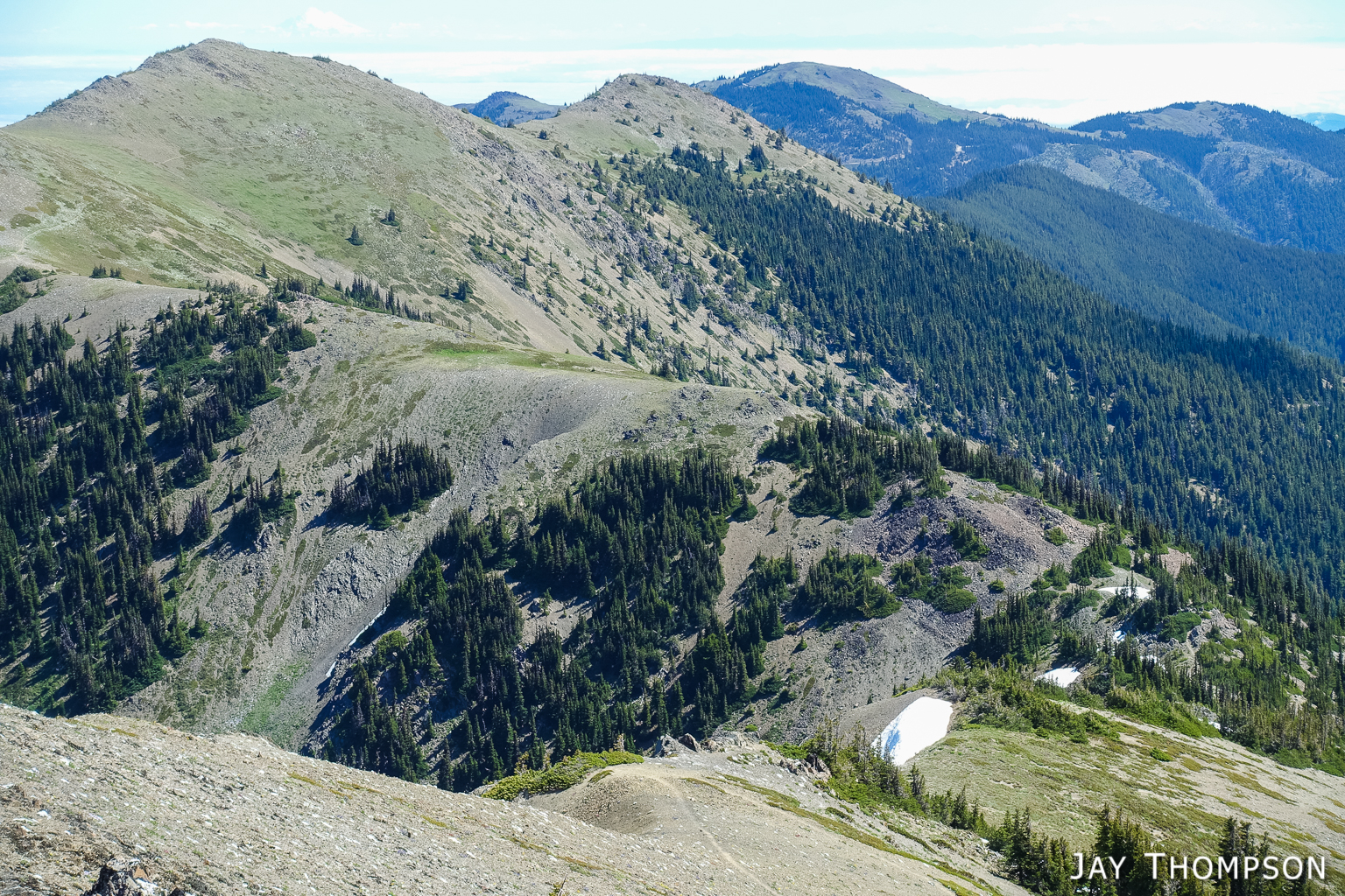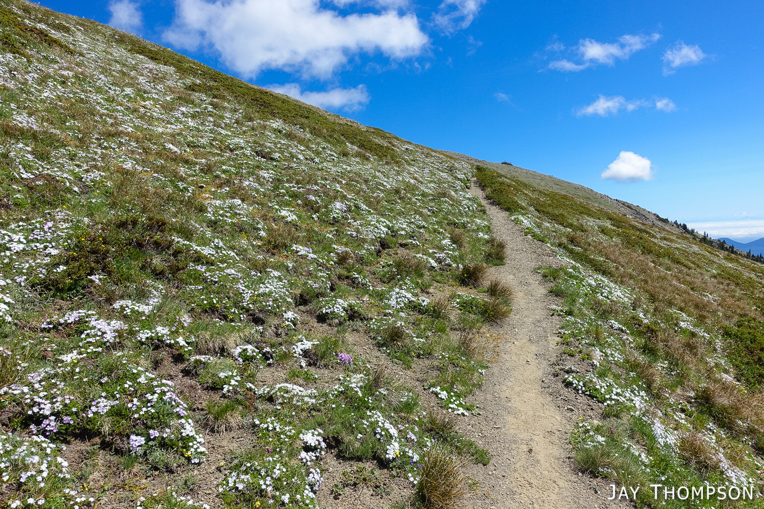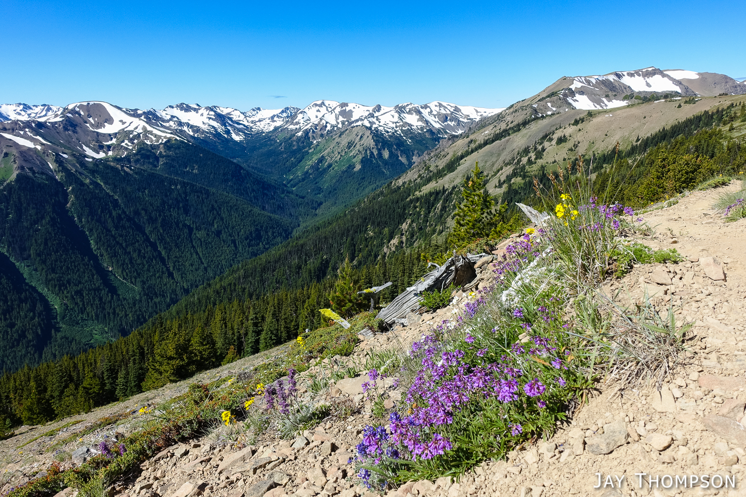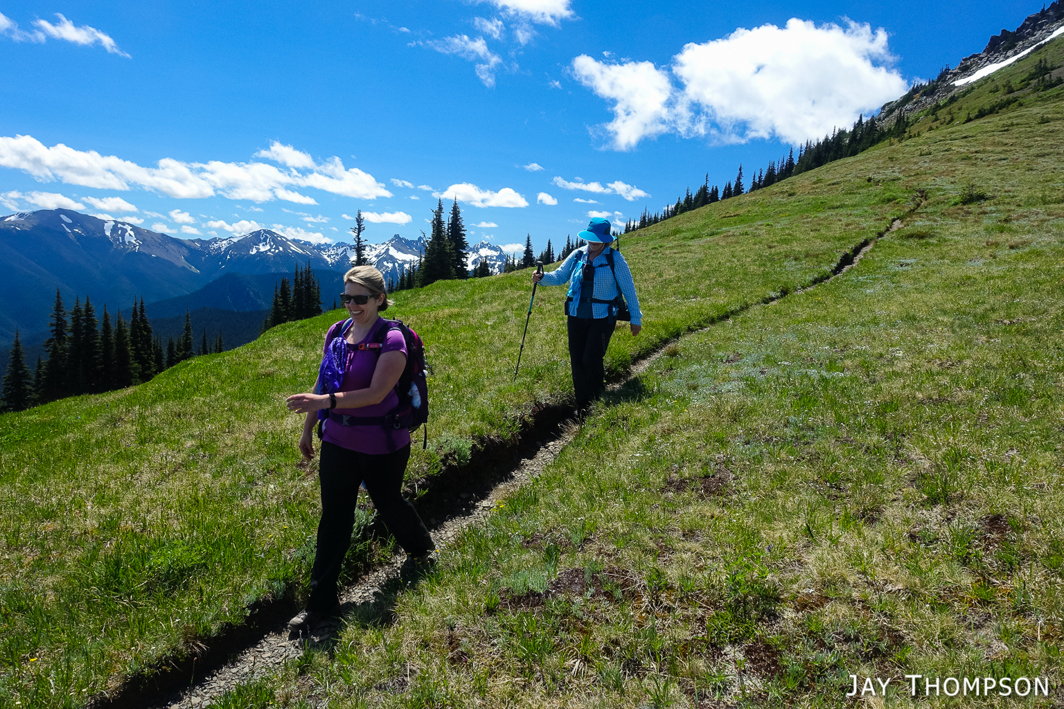 This trail has perhaps the best display of Avalanche lilies I have ever seen. This hike was no exception. If you want to see this for yourself, you need to get up here early, soon after the snow melts.Nice trailThe trail drops down from Deer Park 300-400 feet and is forested for the first couple miles.Before too long the trail gradually climbs again and opens up to the most spectacular views. In my humble opinion, hiking this trail on a cloudy day would be a major bummer since you're going to miss (as Bruce Lee would say) all that heavenly glory!Hard to not enjoy days like thisBecause the views don't suck!Maiden Lake directly below. The body of water in the distance is the Straight of Juan de Fuca. To the upper left of the frame you can see Ediz Hook and part of Port Angeles.My friends Cheryl and Stephanie can barely be seen in the distance.My friends Cheryl and Stephanie can barely be seen in the distance.Spectacular views everywhere you look.Spectacular views everywhere you look.Spectacular views everywhere you look.Great name for a campsite. I think I'll pass.Grand ValleyLooking back along the ridge. You can see almost the entire route from here. The far mountain that is partly forested and partly green on top is Blue Mountain. The start of the hike was just this side of that mountain.I looked back and could see Cheryl and Stephanie sitting there on that point. You can just barely (not really) see them. I kept looking back over 30 minutes or so and they weren't moving so I figured they were not going any further.Selfie timeSome kind of thistle maybe?The line across the side of the mountain in the distance is the Hurricane Ridge Road.Panoramic view from Grand Ridge.Grand Ridge TraIlNice flowers everywhereWild Olympic Mountain onions. YummGrand Ridge TrailGrand Ridge TrailGrand Ridge TrailGrand Ridge TrailGrand Ridge TrailCheryl and Steph. Cheryl doesn't like to have her picture taken so I always try to get at least one, LOL. Look at her hiding under her hat, haha. I'm not sure why she doesn't invite me along on more hikes...Glacier LiliesAvalanche Lilies