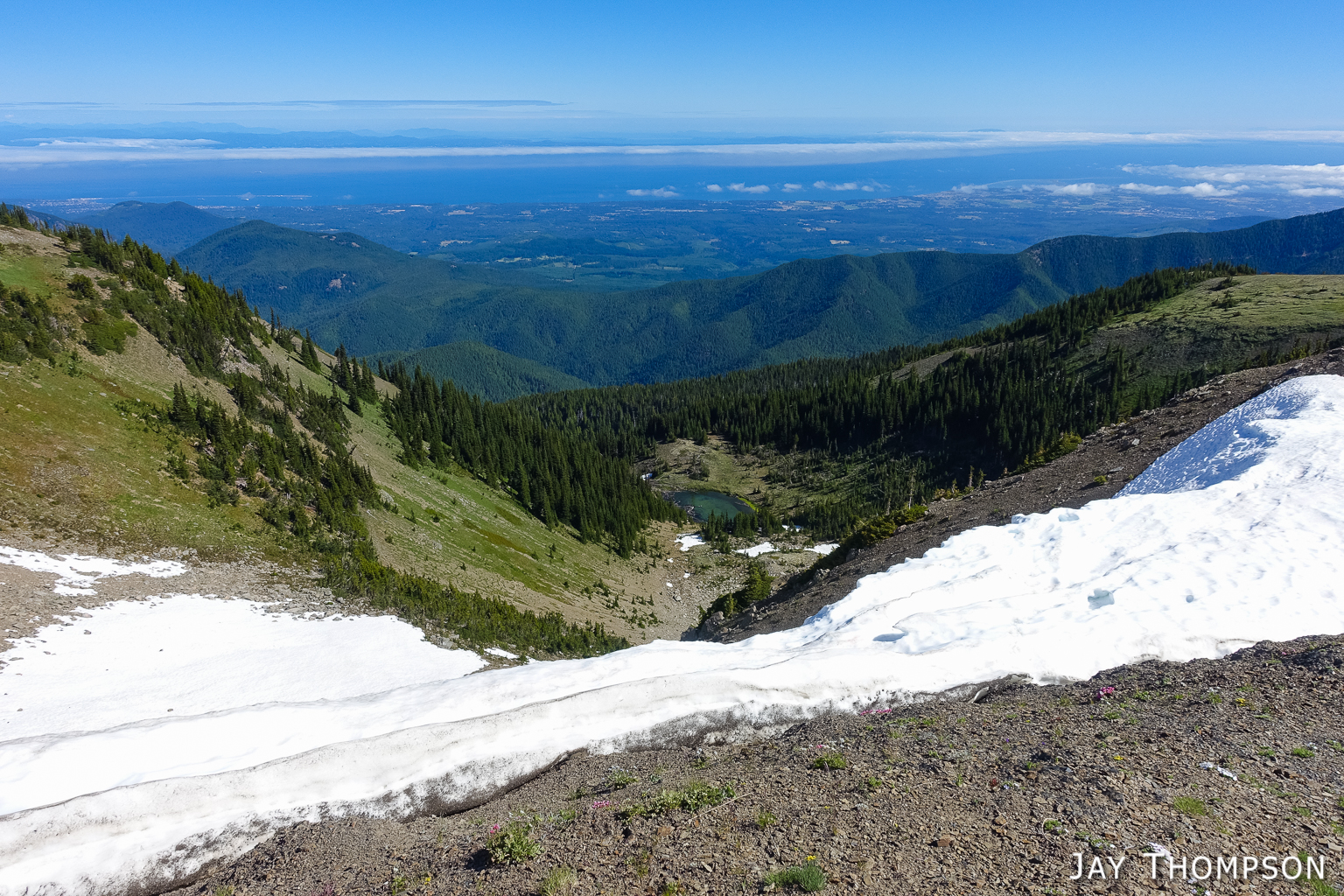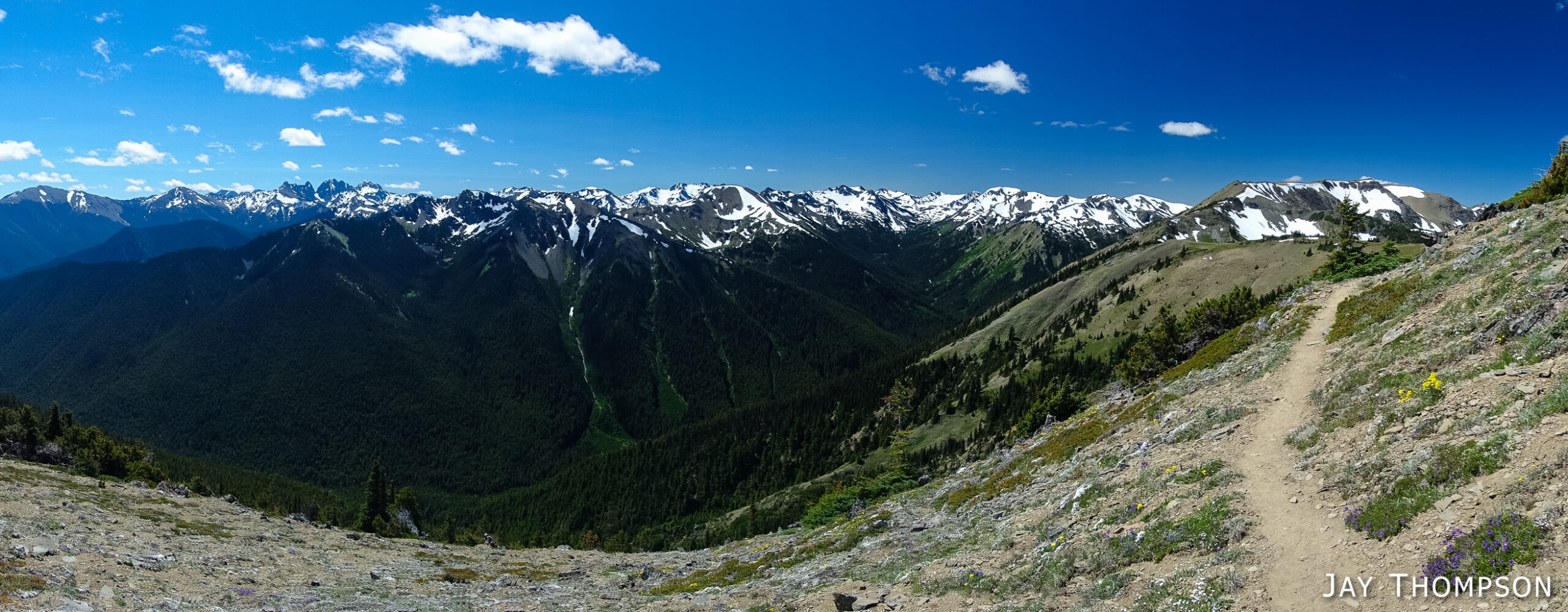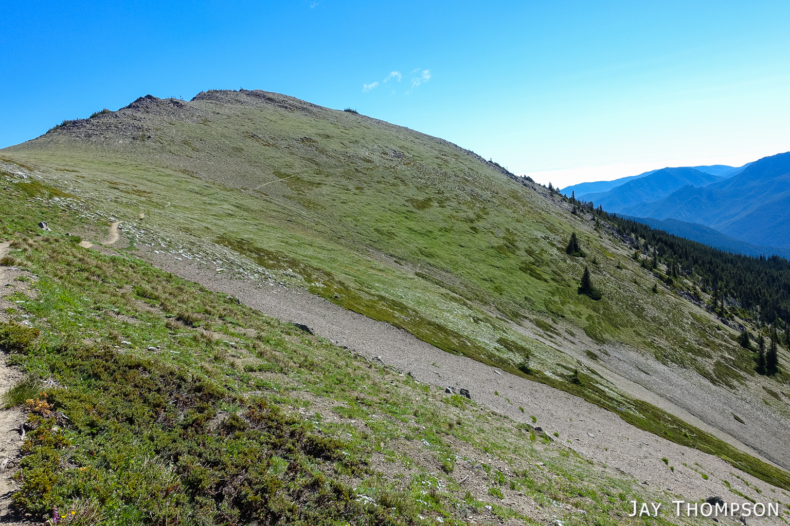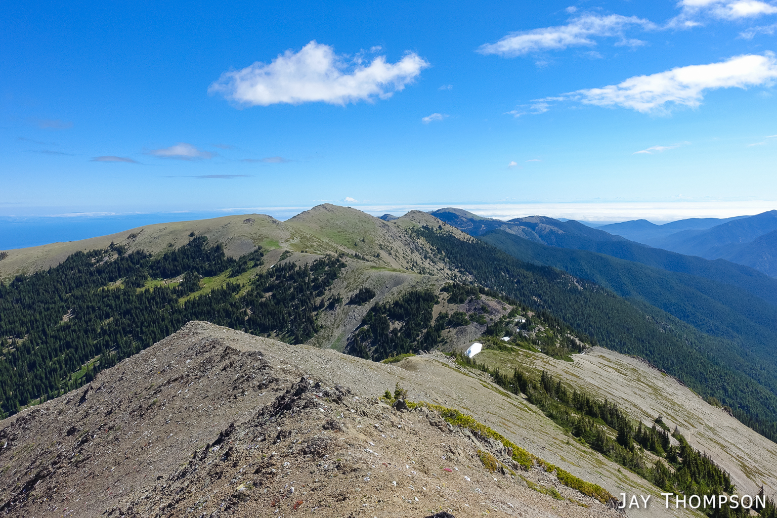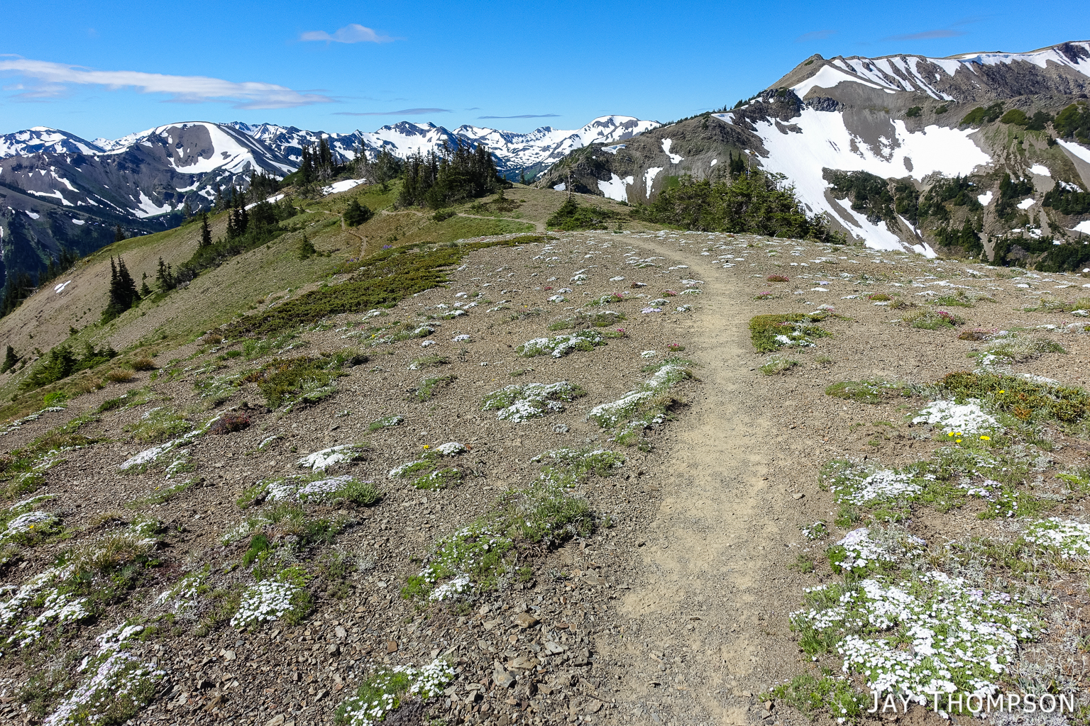 This trail has perhaps the best display of Avalanche lilies I have ever seen. This hike was no exception. If you want to see this for yourself, you need to get up here early, soon after the snow melts.Nice trailThe trail drops down from Deer Park 300-400 feet and is forested for the first couple miles.Before too long the trail gradually climbs again and opens up to the most spectacular views. In my humble opinion, hiking this trail on a cloudy day would be a major bummer since you're going to miss (as Bruce Lee would say) all that heavenly glory!Hard to not enjoy days like thisBecause the views don't suck!Maiden Lake directly below. The body of water in the distance is the Straight of Juan de Fuca. To the upper left of the frame you can see Ediz Hook and part of Port Angeles.My friends Cheryl and Stephanie can barely be seen in the distance.My friends Cheryl and Stephanie can barely be seen in the distance.Spectacular views everywhere you look.Spectacular views everywhere you look.Spectacular views everywhere you look.Great name for a campsite. I think I'll pass.Grand ValleyLooking back along the ridge. You can see almost the entire route from here. The far mountain that is partly forested and partly green on top is Blue Mountain. The start of the hike was just this side of that mountain.I looked back and could see Cheryl and Stephanie sitting there on that point. You can just barely (not really) see them. I kept looking back over 30 minutes or so and they weren't moving so I figured they were not going any further.Selfie timeSome kind of thistle maybe?The line across the side of the mountain in the distance is the Hurricane Ridge Road.Panoramic view from Grand Ridge.Grand Ridge TraIlNice flowers everywhereWild Olympic Mountain onions. YummGrand Ridge TrailGrand Ridge TrailGrand Ridge TrailGrand Ridge TrailGrand Ridge TrailCheryl and Steph. Cheryl doesn't like to have her picture taken so I always try to get at least one, LOL. Look at her hiding under her hat, haha. I'm not sure why she doesn't invite me along on more hikes...Glacier LiliesAvalanche Lilies