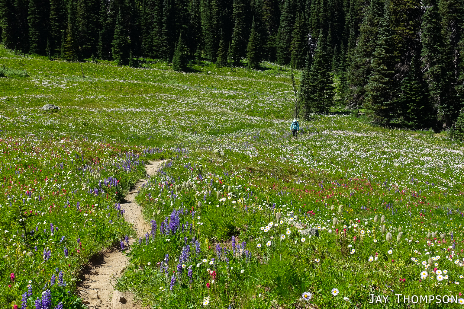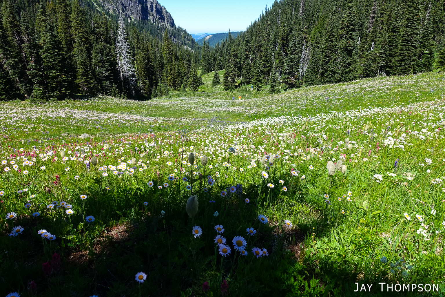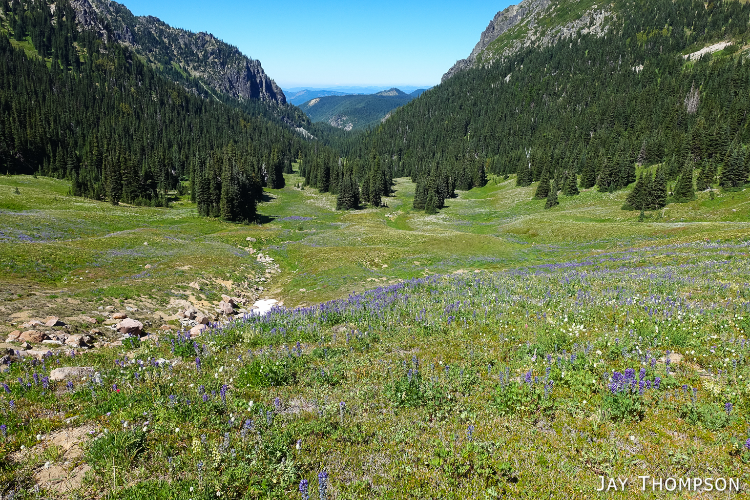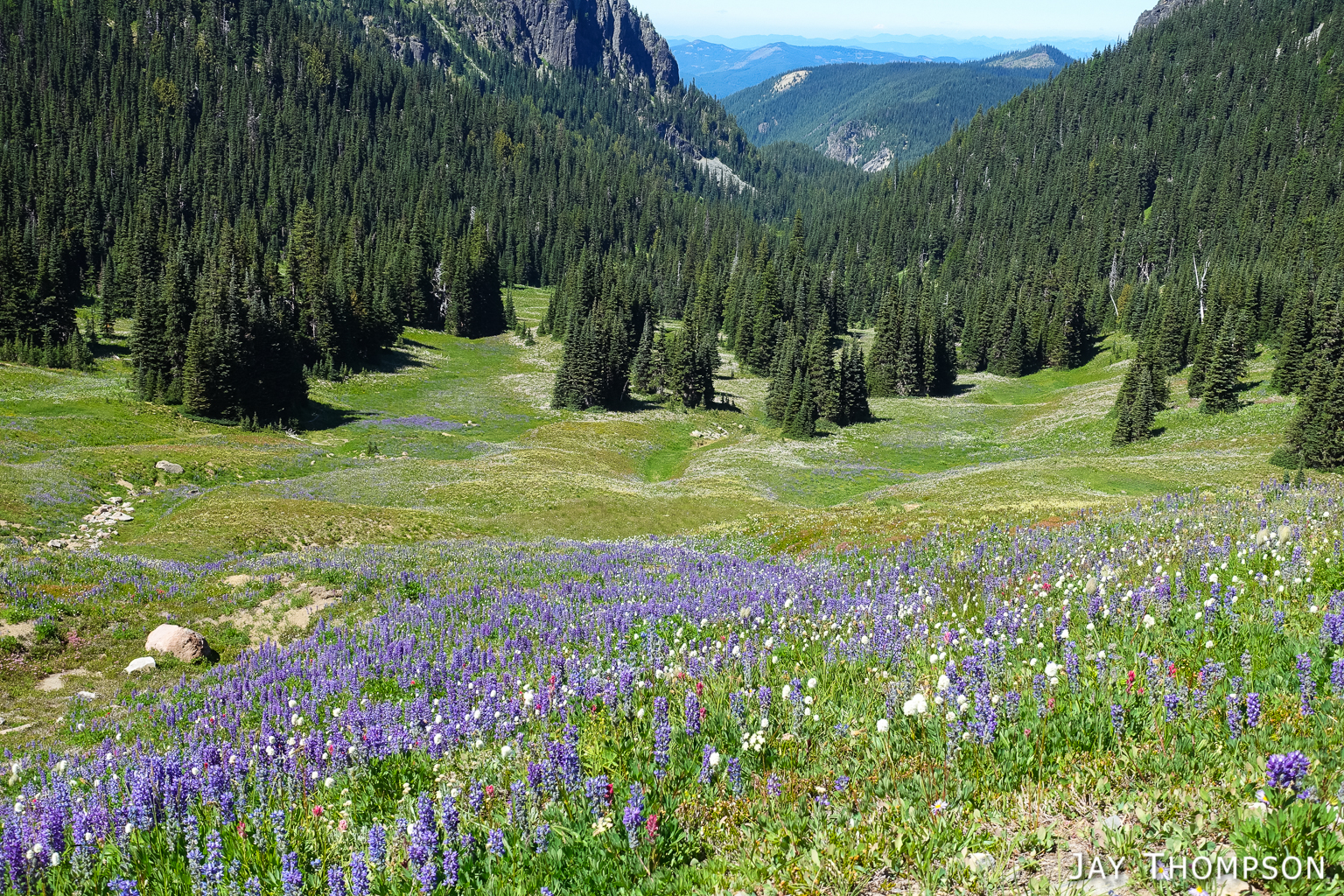 Looking back down at the White river after climbing out of the drainage. We were way up there by the Winthop Glacier just two days prior.Grand Park. This is a really neat place. It's a big flat plateau. After all the ups and downs over the last couple days, this was a nice break. The Fremont lookout is at the top of that pointKatie and Lance in Grand ParkKatie and Lance in Grand ParkLance and I in Grand Park. I think he was hiding from the sun or maybe the bugs? LOLBerkely Park. The flowers were just out of control.Berkely Park. The flowers were just out of control.Berkely Park. It was near here that I drank some unfiltered water that was flowing out of the side of the hill. A few days later I got Giardia or something and had to take antibiotics for ten days to get my system back on track.Berkely Park.Berkely Park. The flowers were just out of control.Berkely Park. The flowers were just out of control.Berkely Park.Berkely Park. Climbing out of here was pretty tough. I wasn't counting on so much more elevation gain after leaving Grand Park. A park ranger I passed as I was almost over the hump going back into Sunrise asked if I was OK, LOL. I must have looked pretty rough. This was a fun trip but a lot harder than I was expecting. So worth it though.