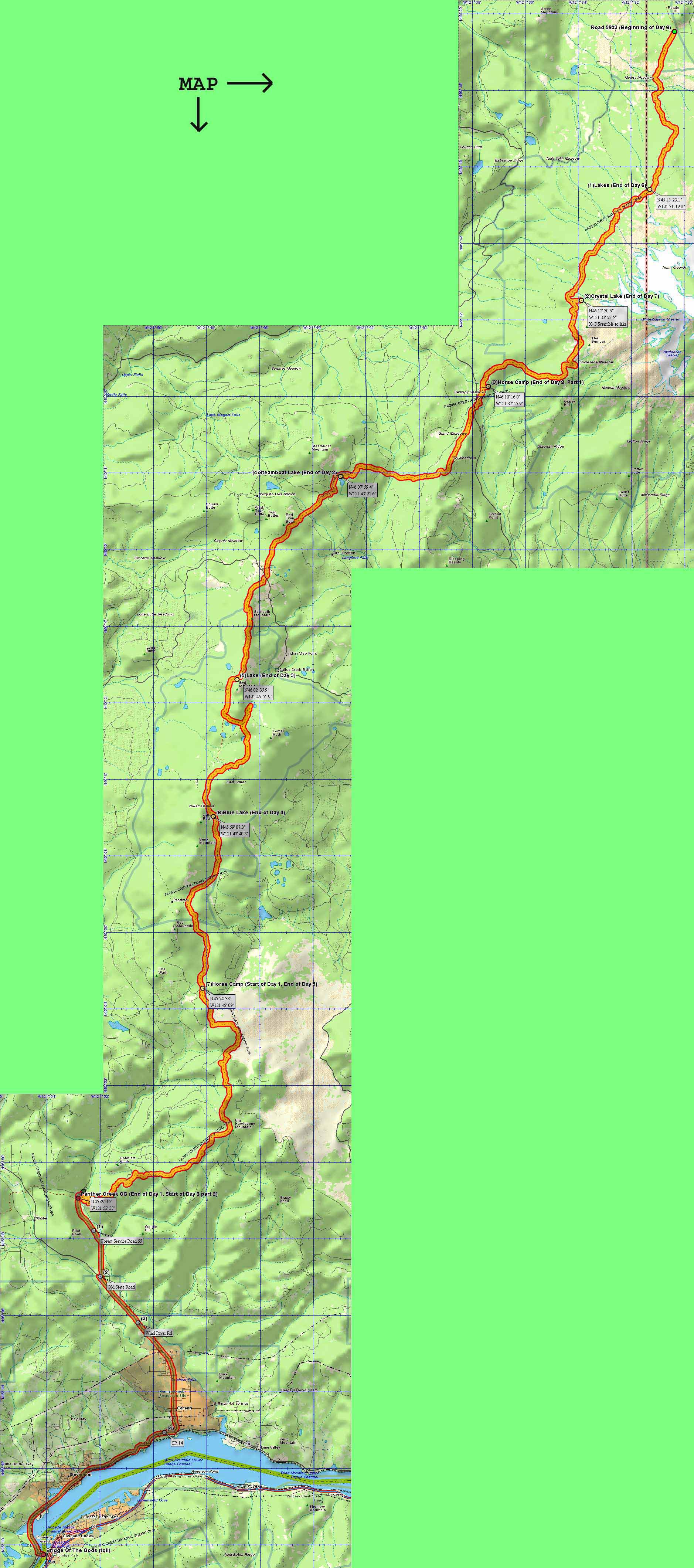 NOTE: This text overlays a large map - it WILL take some time to load - please be patient. Use your scroll bars to move around on this map, and click on camera icons to see photos taken from approximately this point on the trail.