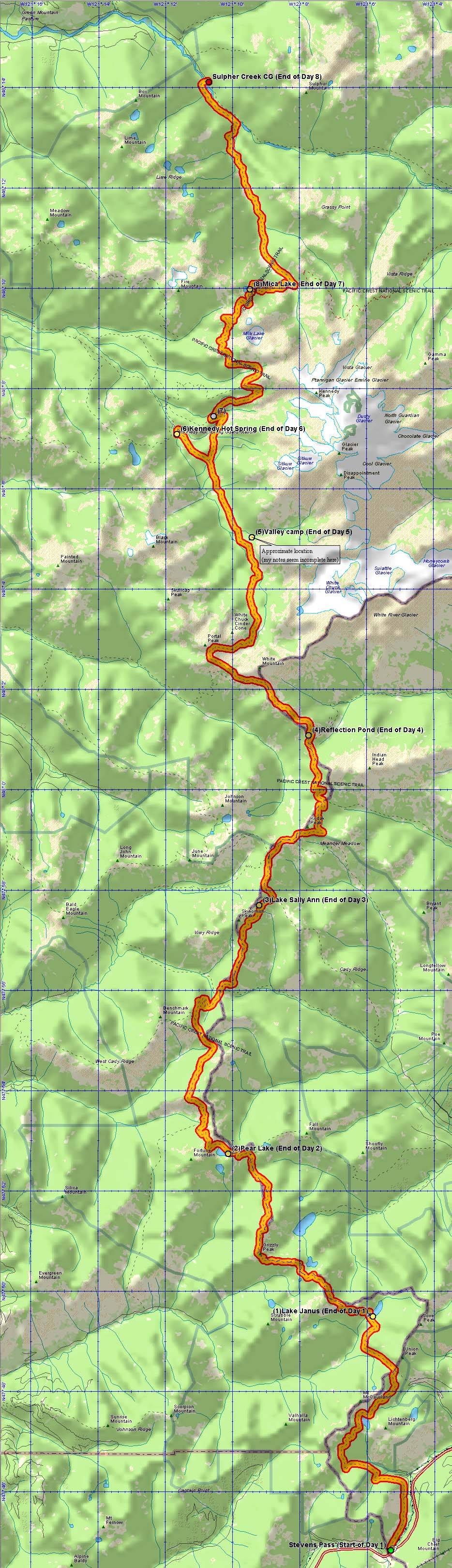 NOTE: This text overlays a large map - it WILL take some time to load - please be patient. Use your scroll bars to move around on this map, and click on camera icons to see photos taken from approximately this point on the trail.