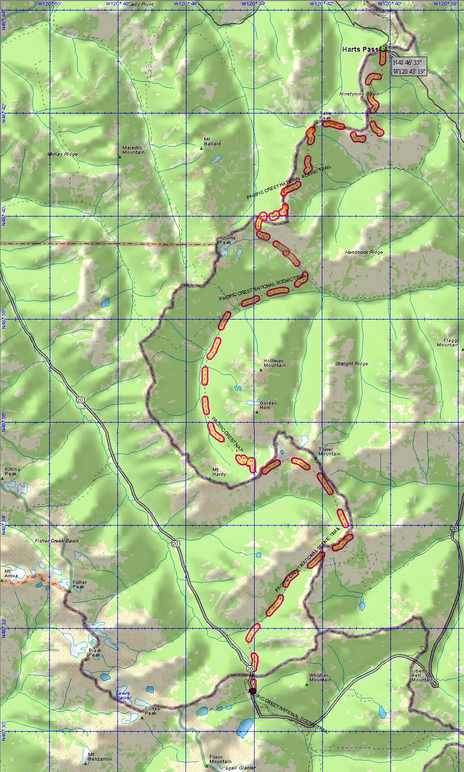 NOTE: This text overlays a large map - it WILL take some time to load - please be patient. Use your scroll bars to move around on this map. This section has not been hiked yet, so there are no pictures to click on - sorry!